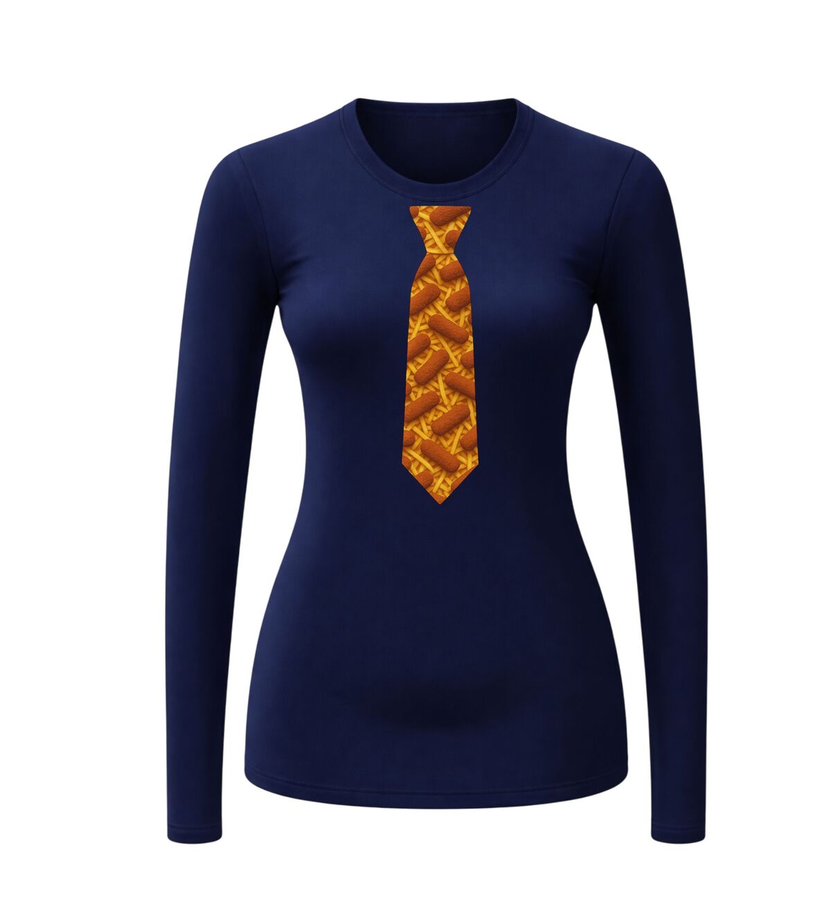 Waarom een saaie outfit dragen als je ook kunt schitteren met een stropdas vol kroketten? Deze hilarische unisex longsleeve is hét shirt voor iedereen die weet dat echte stijl begint bij de snackbar!