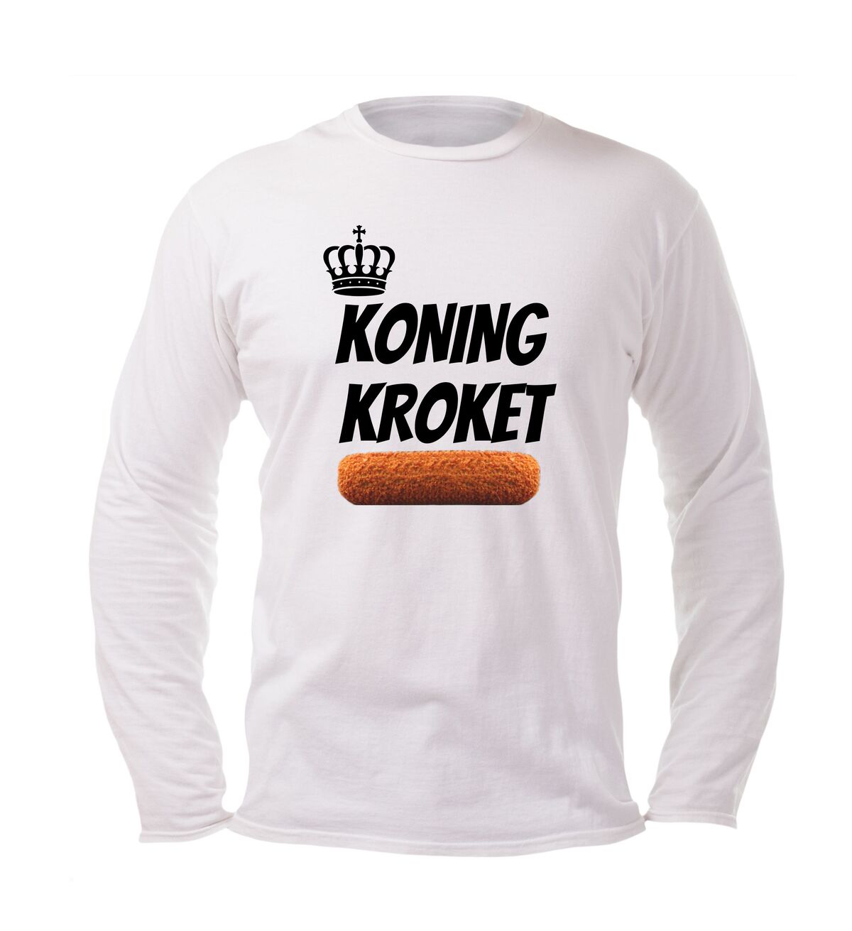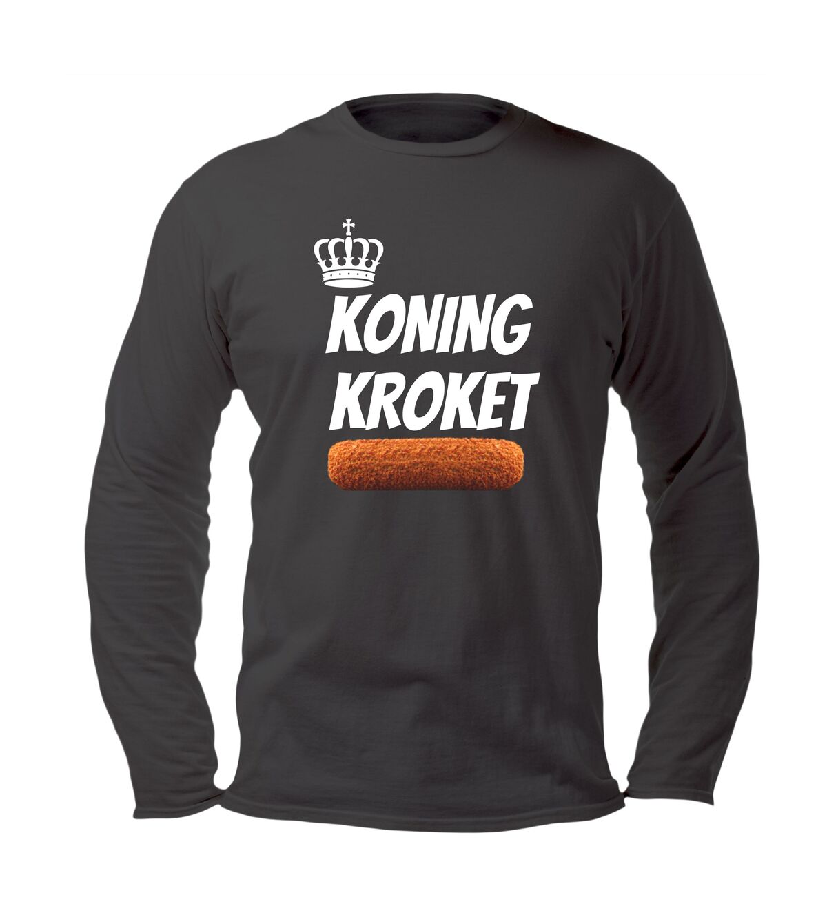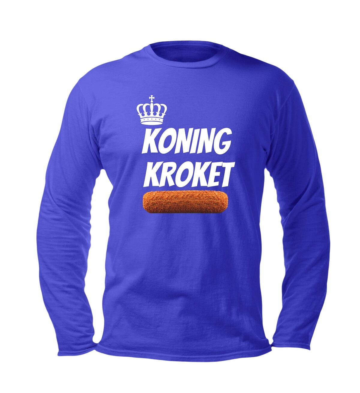 Krokettenliefhebbers, dit is jullie moment! Met deze originele unisex longsleeve met de tekst “Koning Kroket” en een stoere kroket-afbeelding. laat jij aan iedereen zien wie de ware snackkoning is. Of je nu relaxt op de bank zit, naar een feestje gaat of gewoon iets grappigs en unieks wilt dragen – dit shirt is dé eyecatcher.