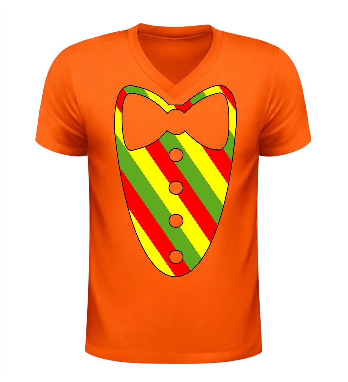 De smoking opdruk zorgt voor een chique knipoog, terwijl de kleuren rood, geel en groen het echte carnavalsgevoel oproepen. Of je nu door het centrum van Maastricht trekt, feestviert op het Vrijthof of tot in de late uurtjes in de kroegen staat, dit carnaval V-hals shirt laat zien dat jij klaar bent voor feest. Het design is speels, herkenbaar en perfect voor wie een originele carnavalslook zoekt zonder verkleedpak.