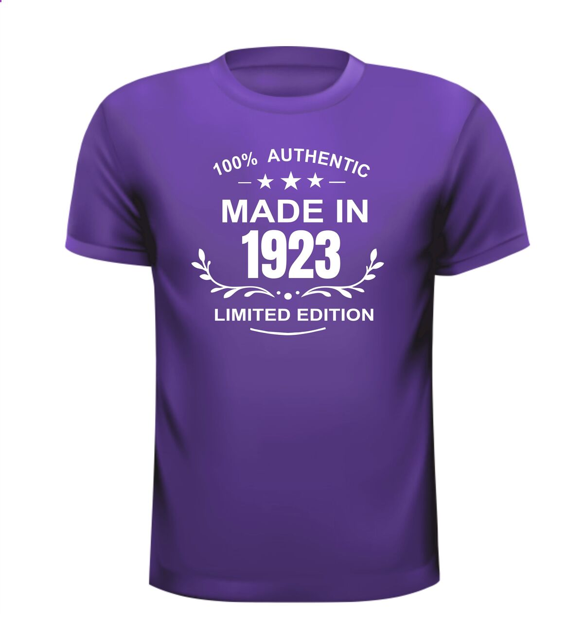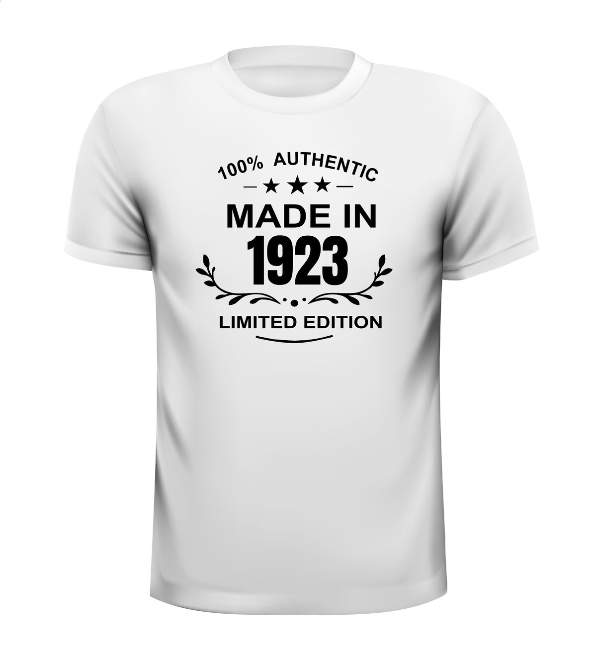 Een verjaardag is maar één dag, maar stijl blijft een leven lang. Dit 100% Authentic - Made in 1923 - Limited Edition shirt is de perfecte manier om een mijlpaal te vieren. Stoer, modern en ontworpen met oog voor detail — precies zoals een écht jubileum eruit hoort te zien. Geef jezelf of iemand anders een onvergetelijk cadeau. Draag ‘m met trots op de verjaardag, tijdens het feest of gewoon elke dag daarna. Want 1923 is niet zomaar een jaartal het is historie. En dat mag gezien worden.