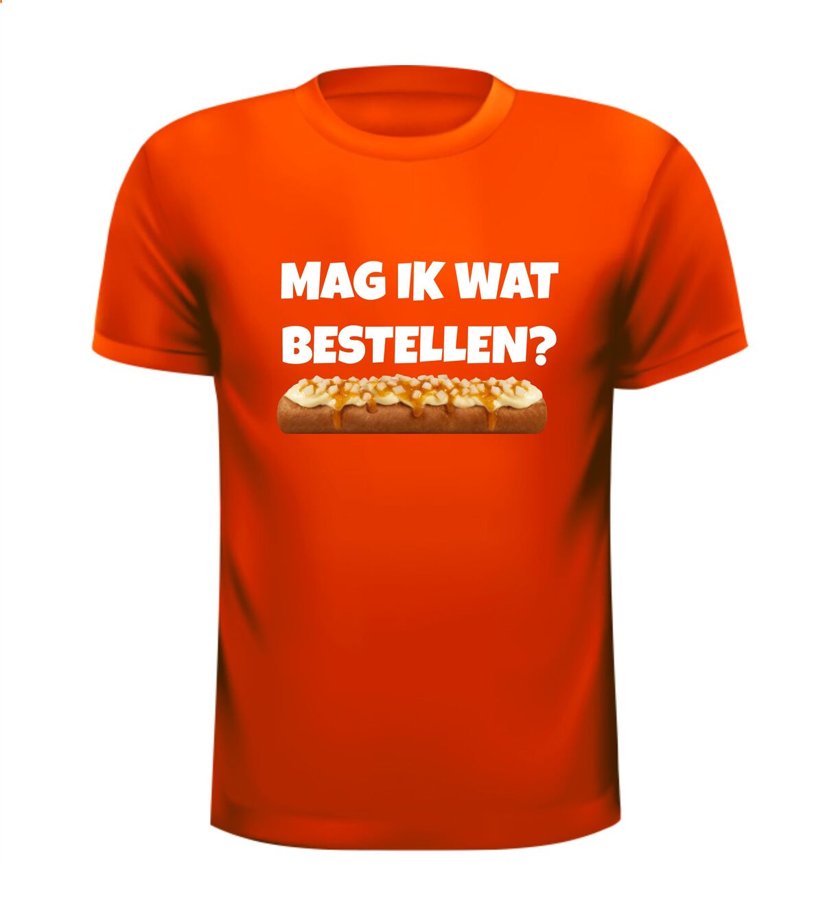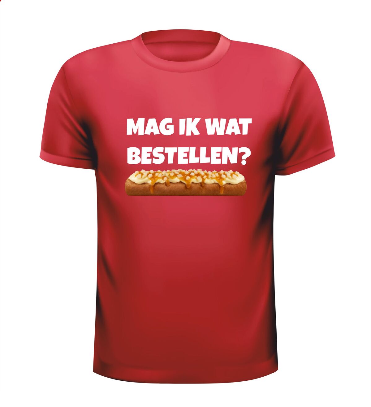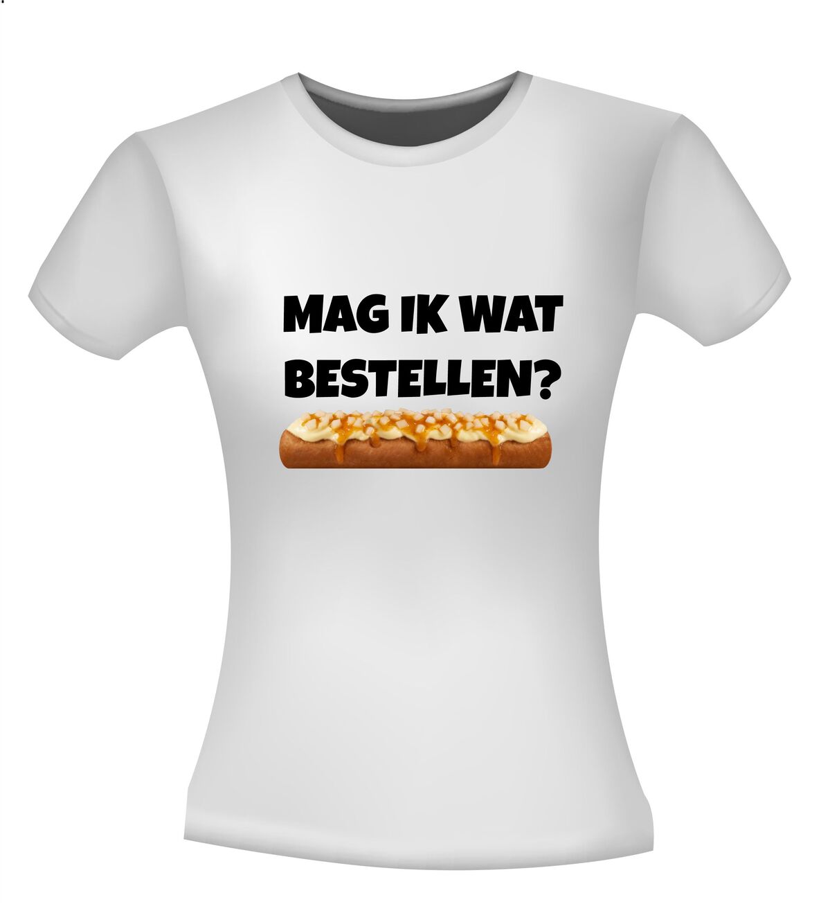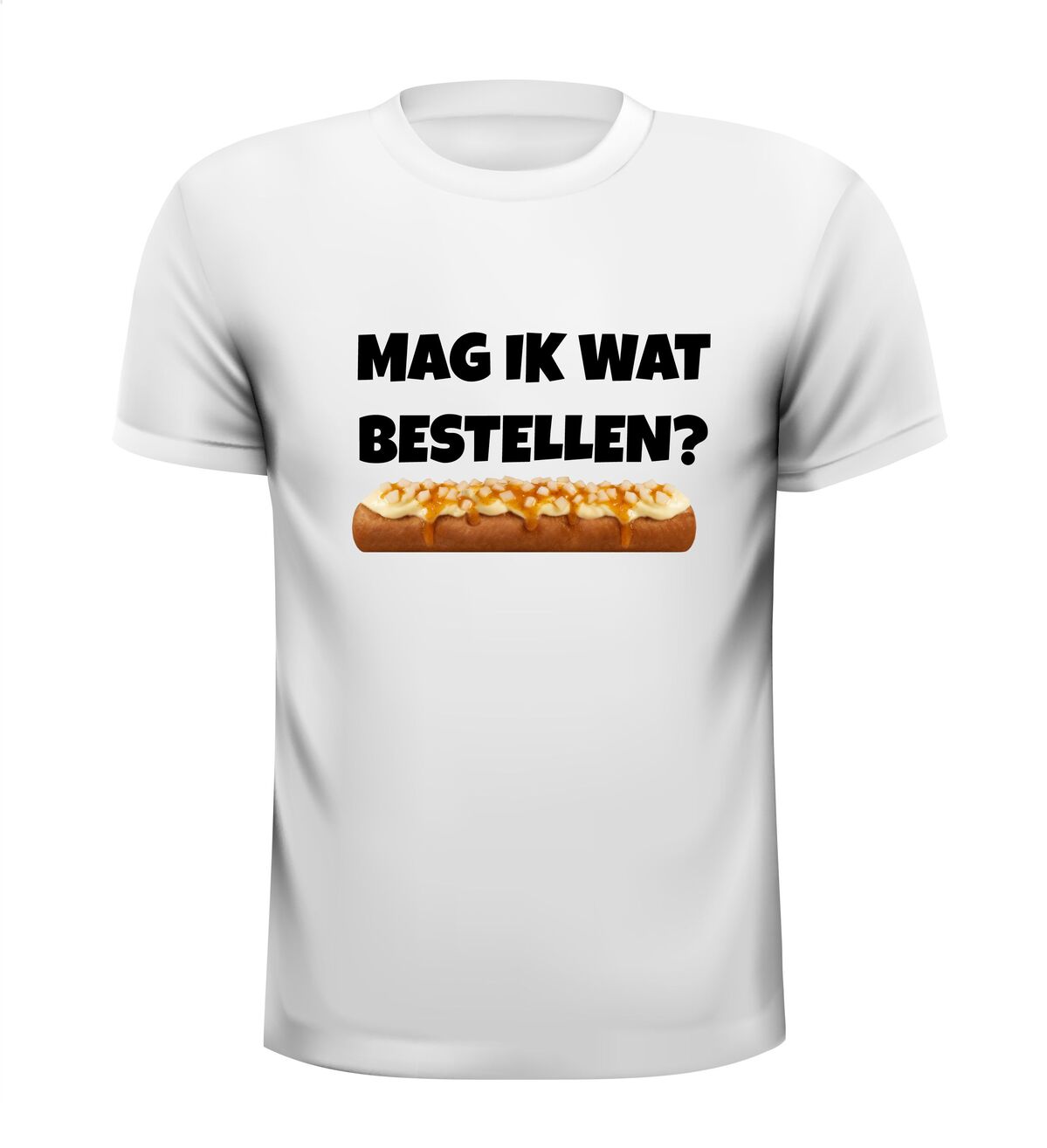 Een leuk t-shirt met de tekst : Mag ik wat bestellen? en daaronder een frikandel speciaal afgebeeld als foto print!