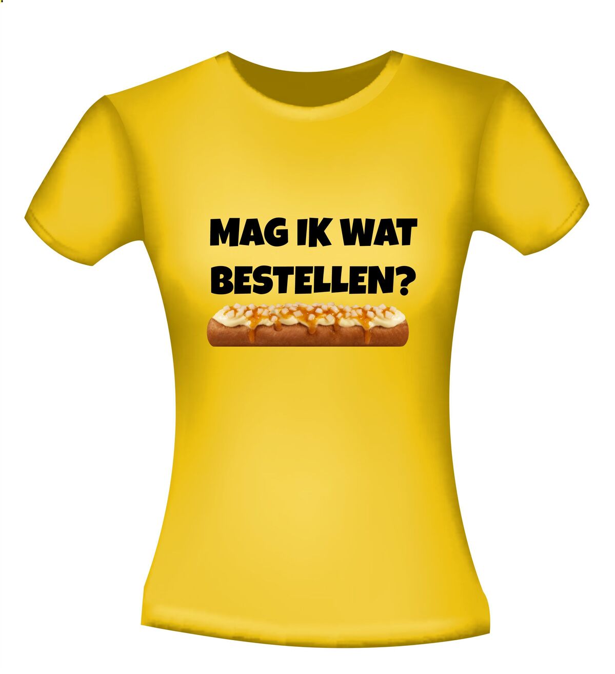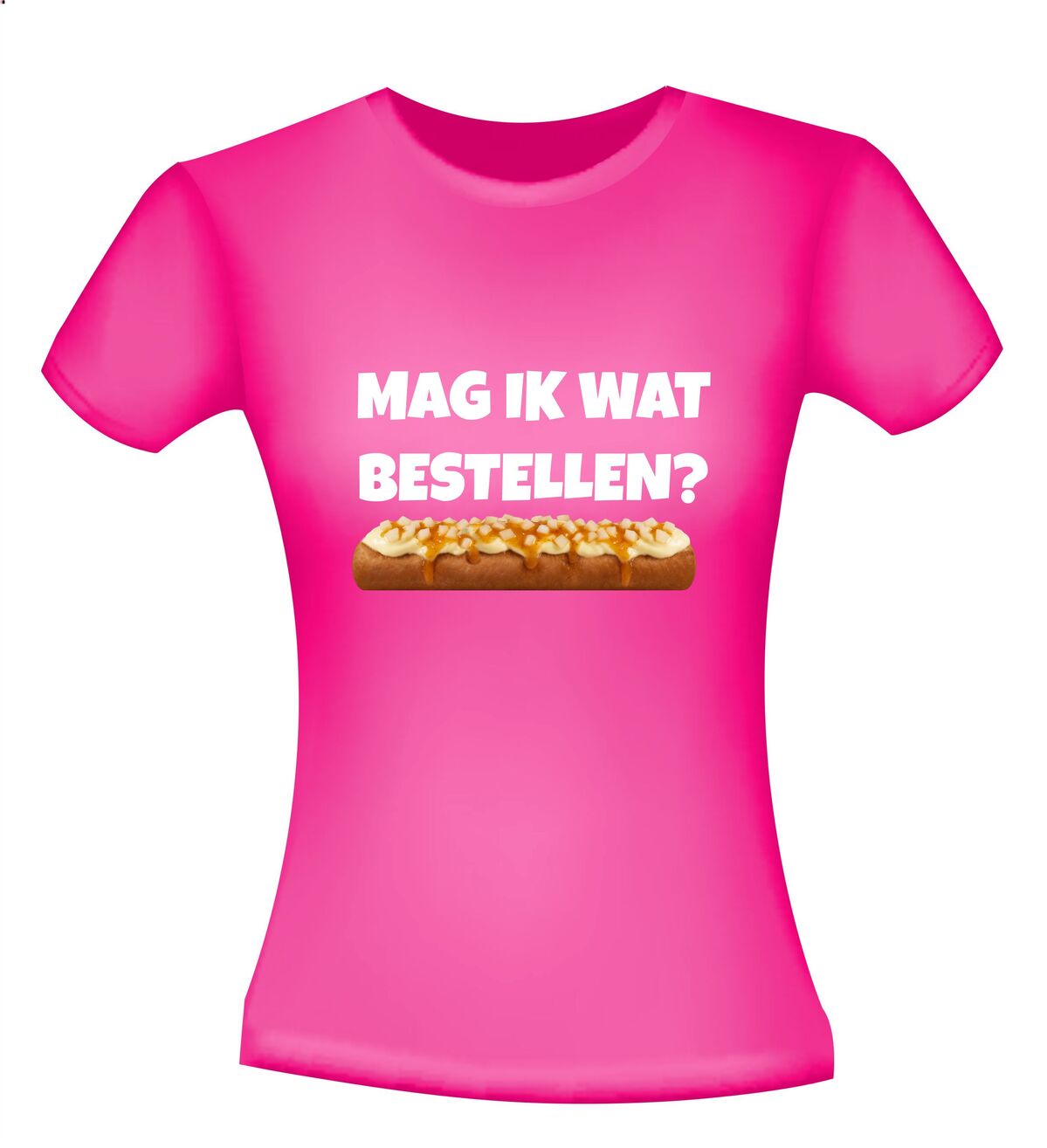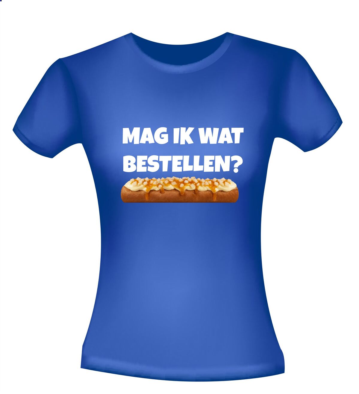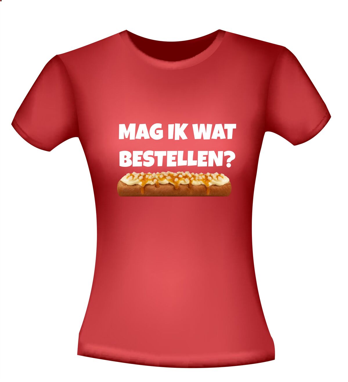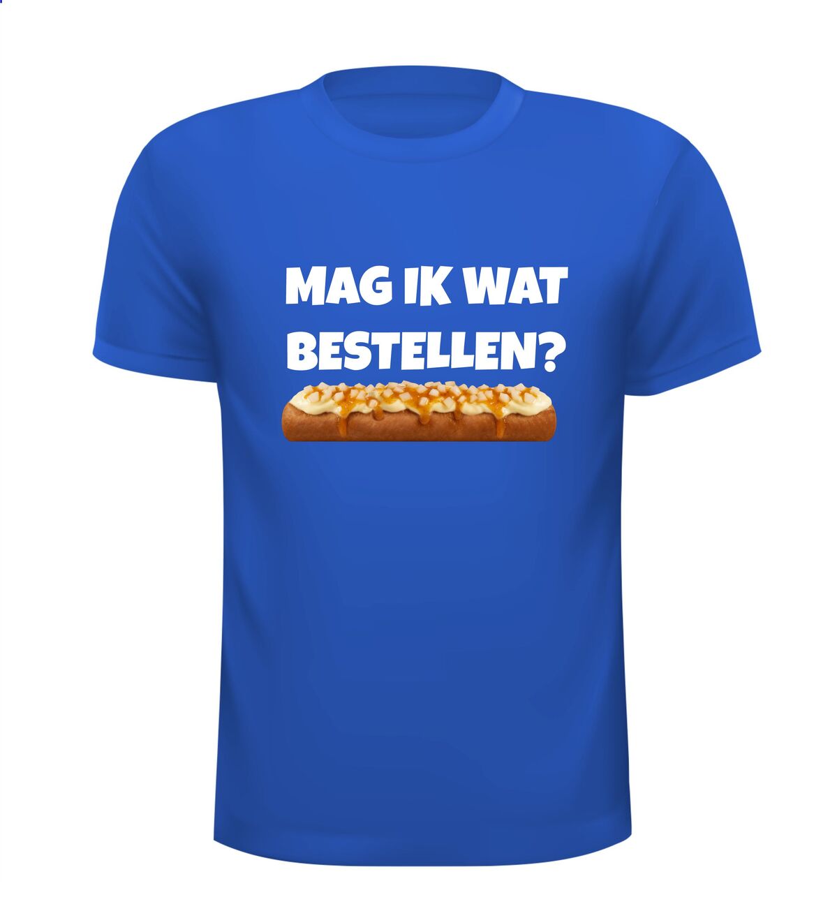 Een leuk t-shirt met de tekst : Mag ik wat bestellen? en daaronder een frikandel speciaal afgebeeld als foto print!