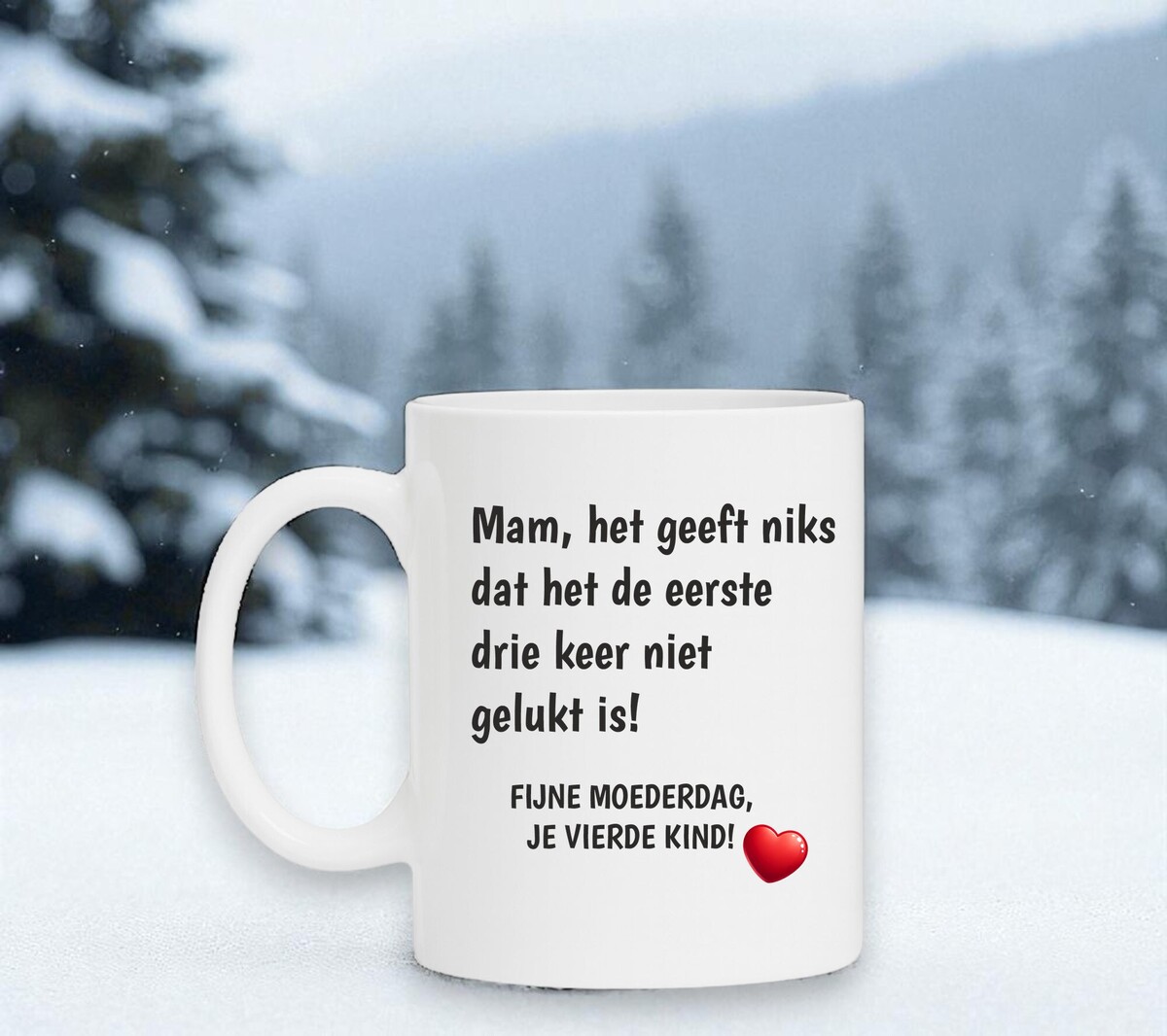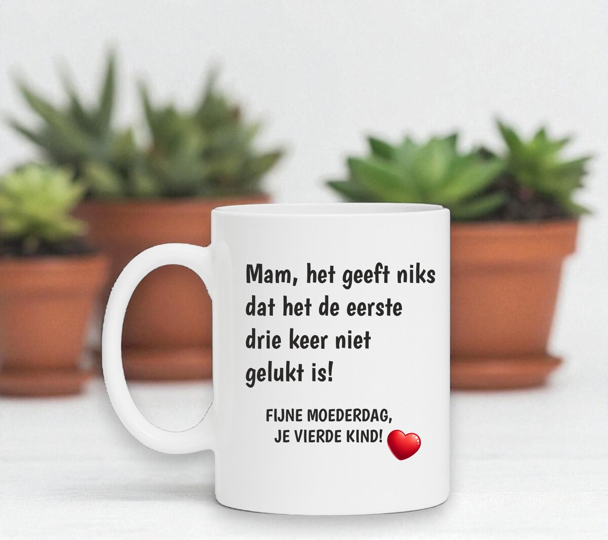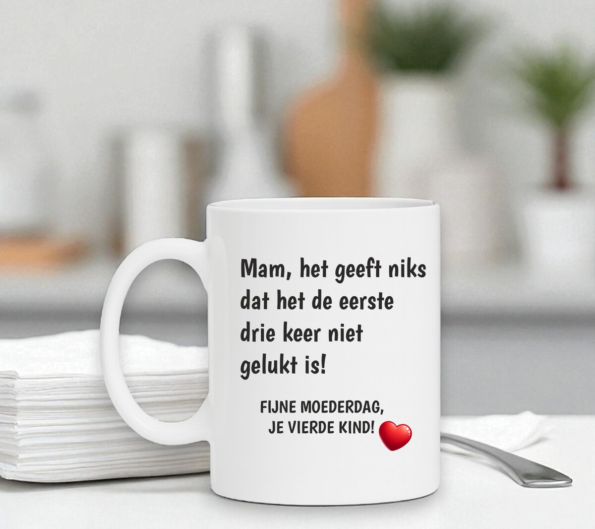 Ben jij het vierde kind van je moeder dan is dit een geweldig leuk en grappig Moederdag cadeau. Op de koffiemok staat de tekst ‘Mam het geeft niks dat het de eerste drie keer niet gelukt is! Fijne Moederdag. Je vierde kind!’