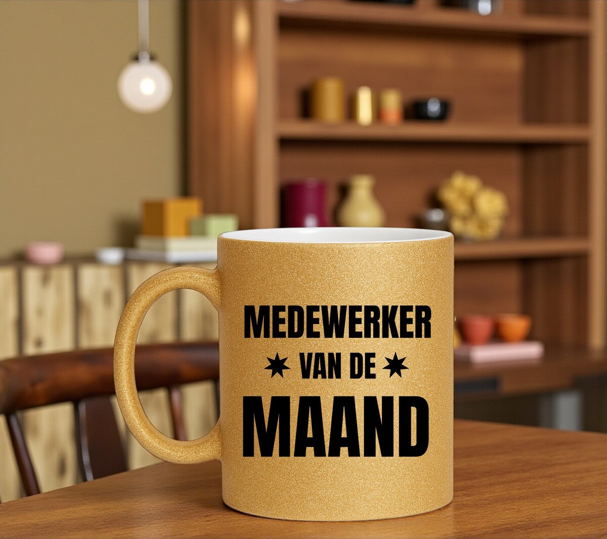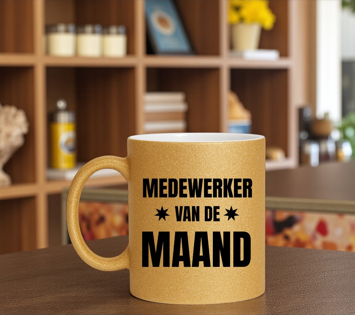 Een gouden glitter mok voor de medewerker van de maand. Handwas aanbevolen! Microgolfbestendig. De mok is gemaakt van wit keramiek en is aan de buitenkant volledig bedekt met gouden glitters. De glitter mok heeft een hoogte van 96mm en een diameter van 80mm.