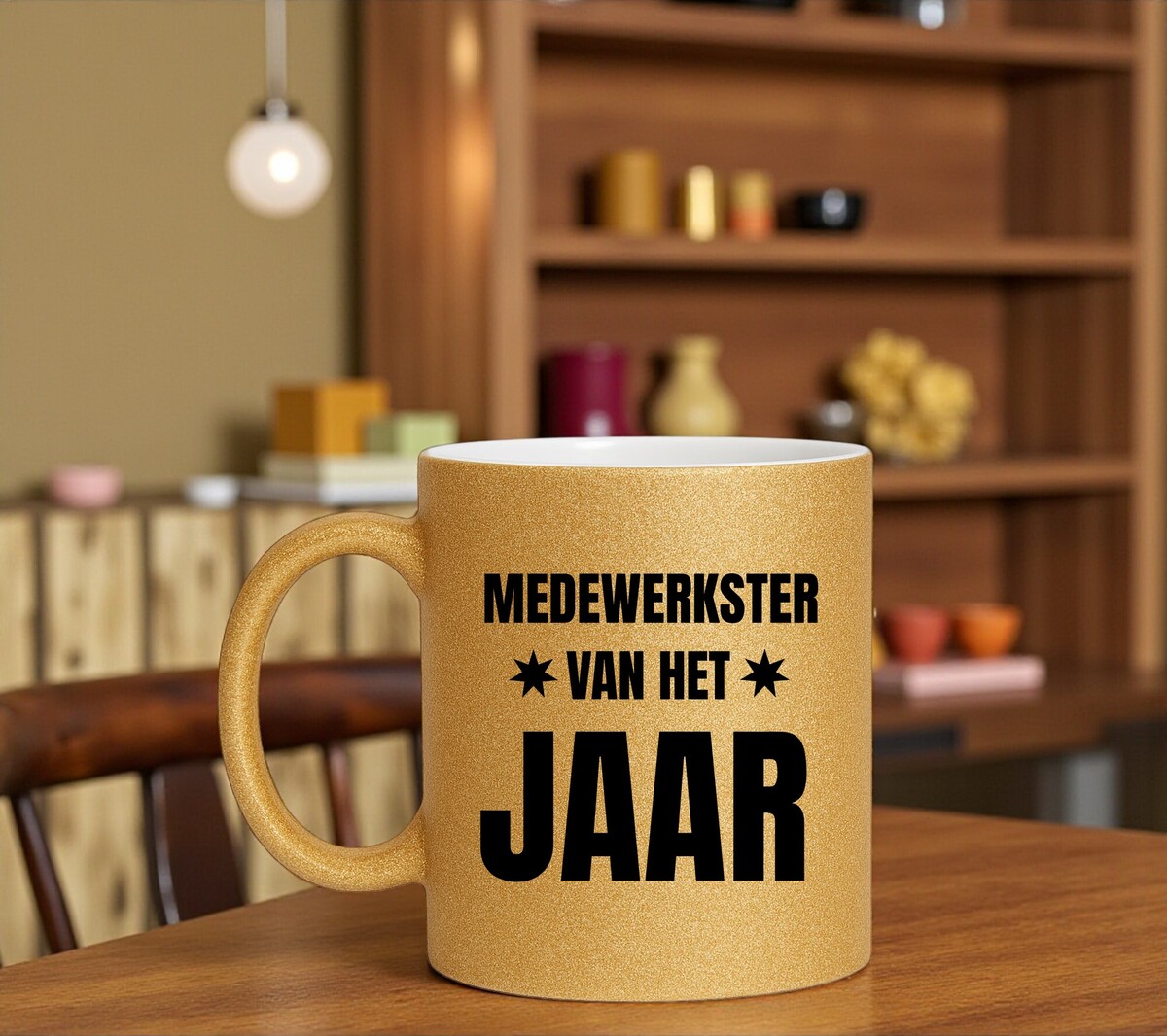 Een opvallende gouden glitter koffie of thee mok voor de medewerkster van de maand. Handwas aanbevolen! Microgolfbestendig. De mok is gemaakt van wit keramiek en is aan de buitenkant volledig bedekt met gouden glitters. De glitter mok heeft een hoogte van 96mm en een diameter van 80mm.
