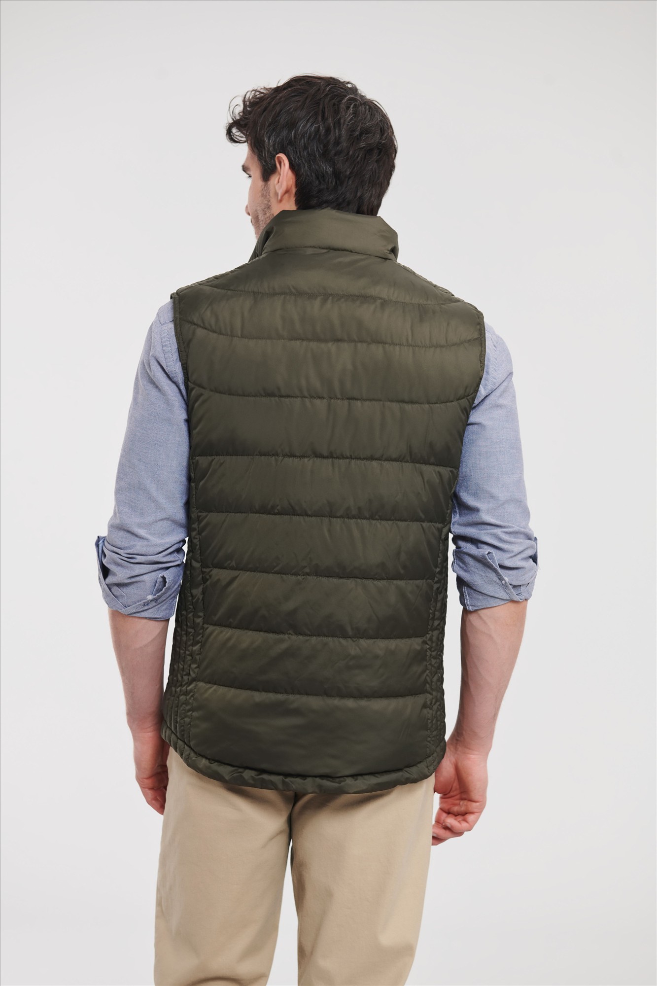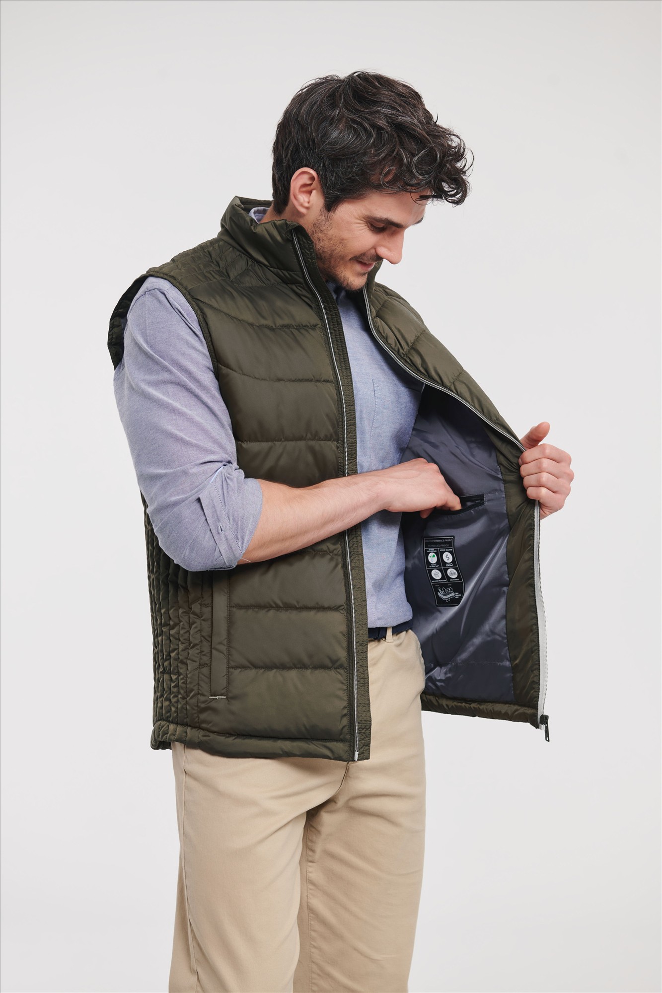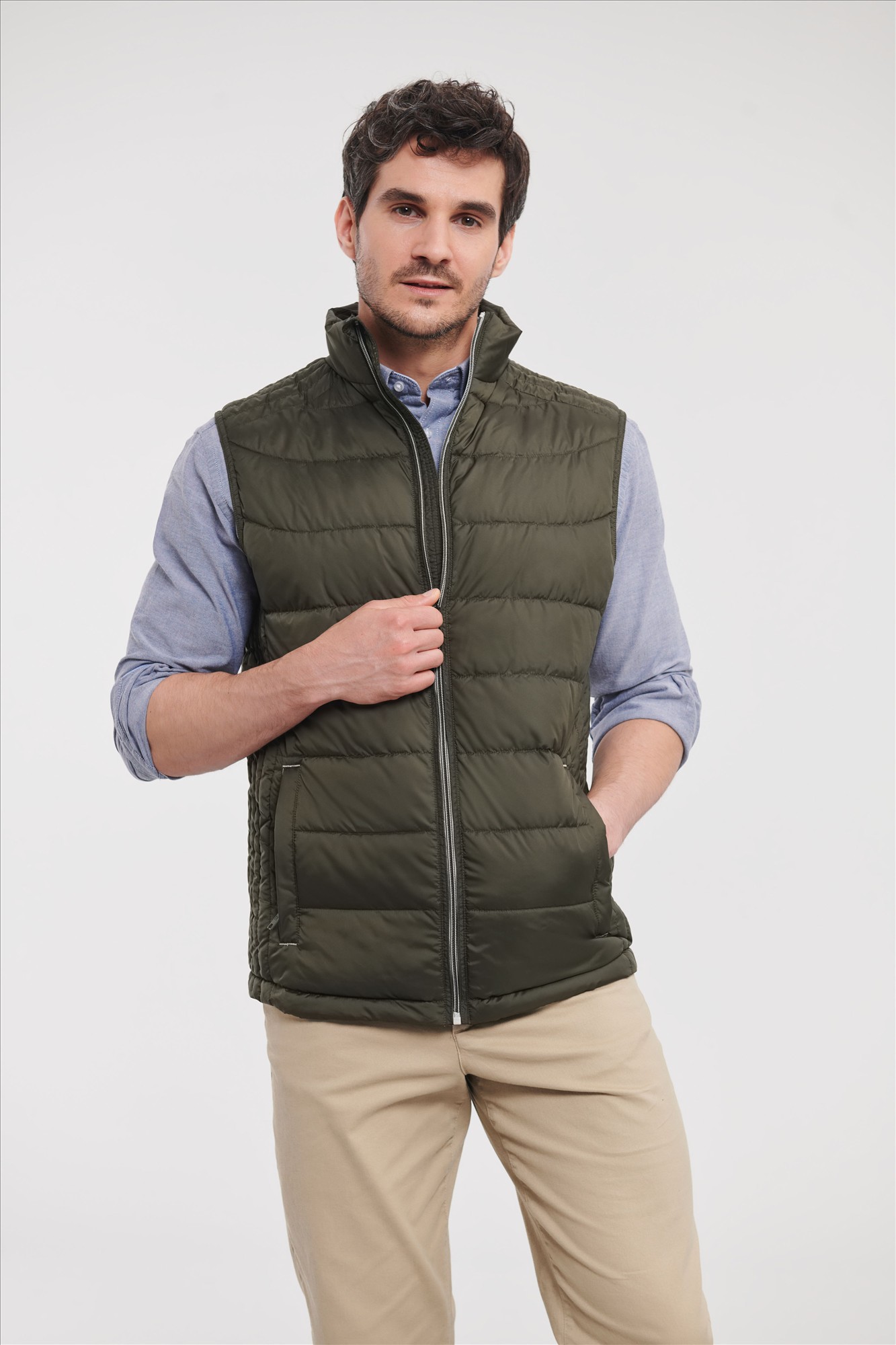 Moderne Russell Nano Heren Bodywarmer dark olive. Ontdek de perfecte mix van stijl en functionaliteit met onze Russell Men Nano Bodywarmer, ontworpen voor de man die waarde hecht aan zowel esthetiek als praktisch nut. Deze trendy heren bodywarmer is met precisie gemaakt van topkwaliteit DWR-stof, die garant staat voor een uitstekende waterbestendigheid. Het moderne design wordt geaccentueerd door contrasterende ritsen, een voering en subtiele details die samen een chique, hedendaagse look creëren. Uitgerust met twee externe zakken en een veilig afsluitbare binnenzak, biedt deze bodywarmer voldoende ruimte voor al uw essentiële items. De bodywarmer is niet alleen een modieus item voor over een polo of trui, maar biedt ook bescherming tegen de elementen dankzij de waterafstotende, ademende en winddichte eigenschappen. Materiaal:100% Polyester. Land van herkomst:China. De foto van het model dient ter illustratie van de sfeer. Gelieve geen aandacht te besteden aan de kleur.