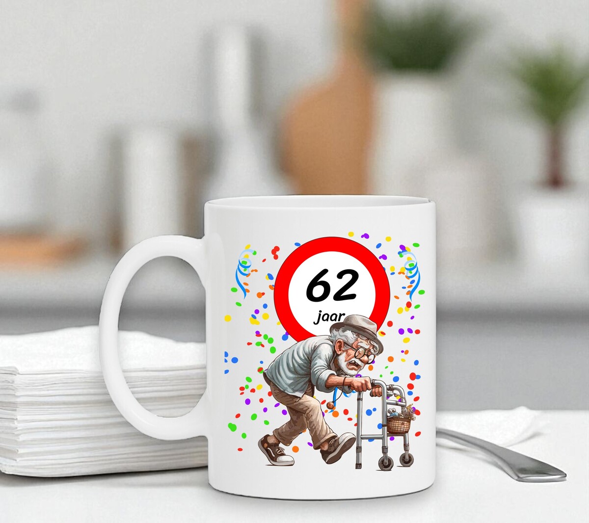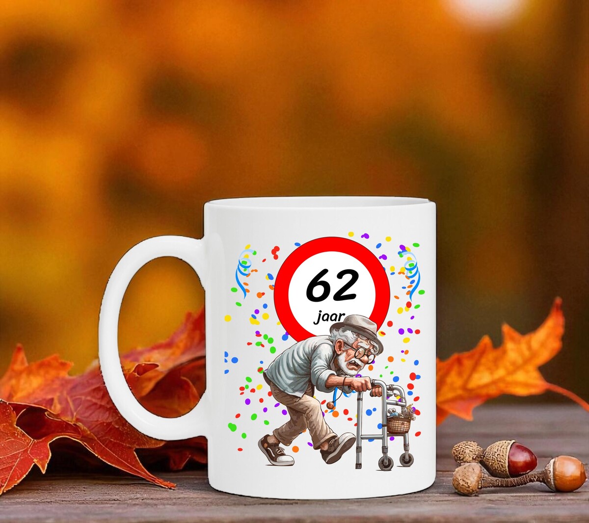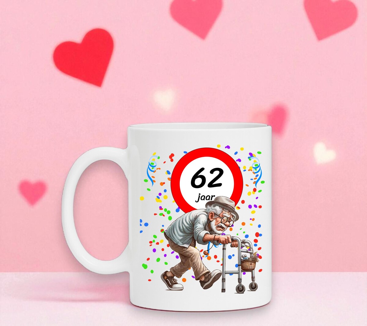 Verras iemand die 62 jaar jong wordt met deze full colour bedrukte mok, compleet met een hilarische afbeelding van een oude opa met rollator! Perfect als grappig cadeau voor een verjaardag, jubileum of gewoon om een glimlach op iemands gezicht te toveren. Deze mok is dé manier om te vieren dat 62 worden een geweldige mijlpaal is, met een vleugje humor!