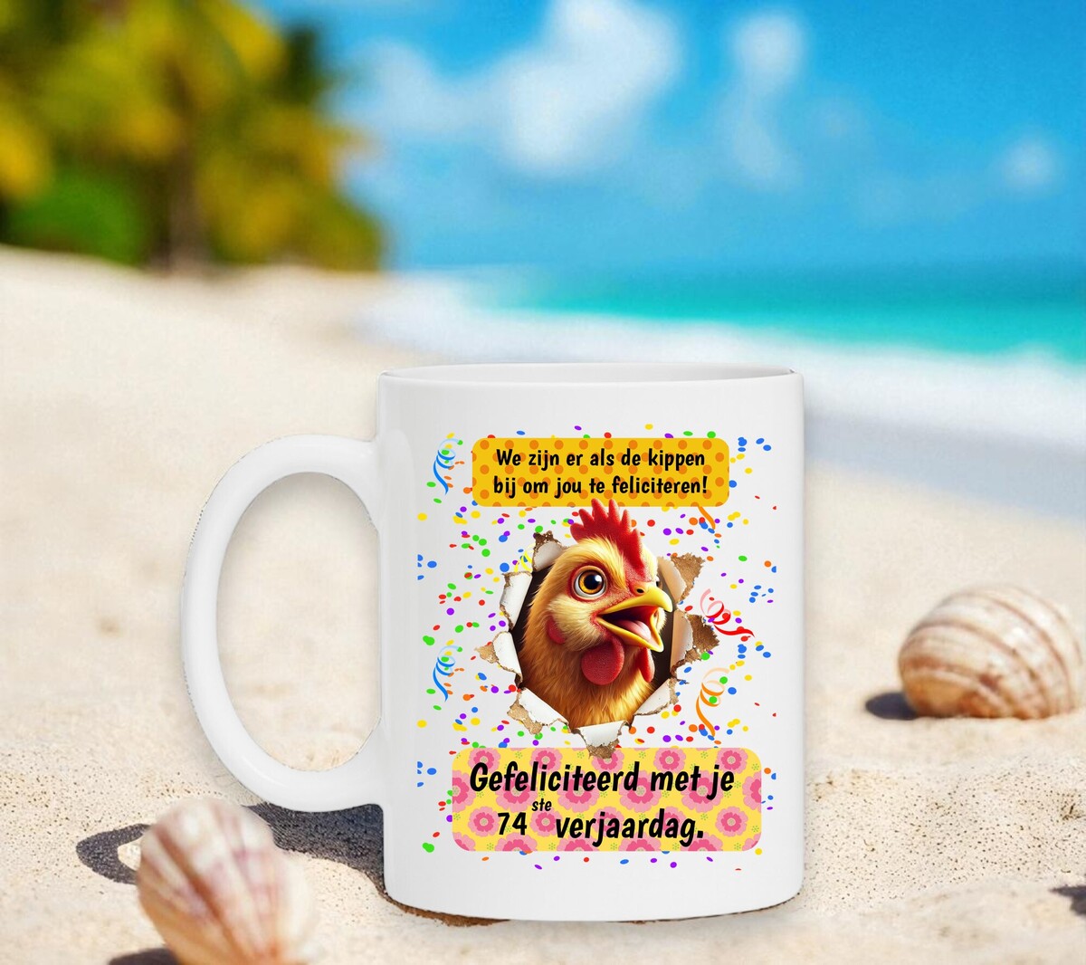 Een superleuke koffiemok als presentje voor een hem of haar die 74 jaar wordt! Op de mok staat een fraaie kippen print met de tekst ‘We zijn er als de kippen bij om jou te feliciteren!’ Gefeliciteerd met je 74ste verjaardag’ Weer eens wat anders dan een bloementje sturen!