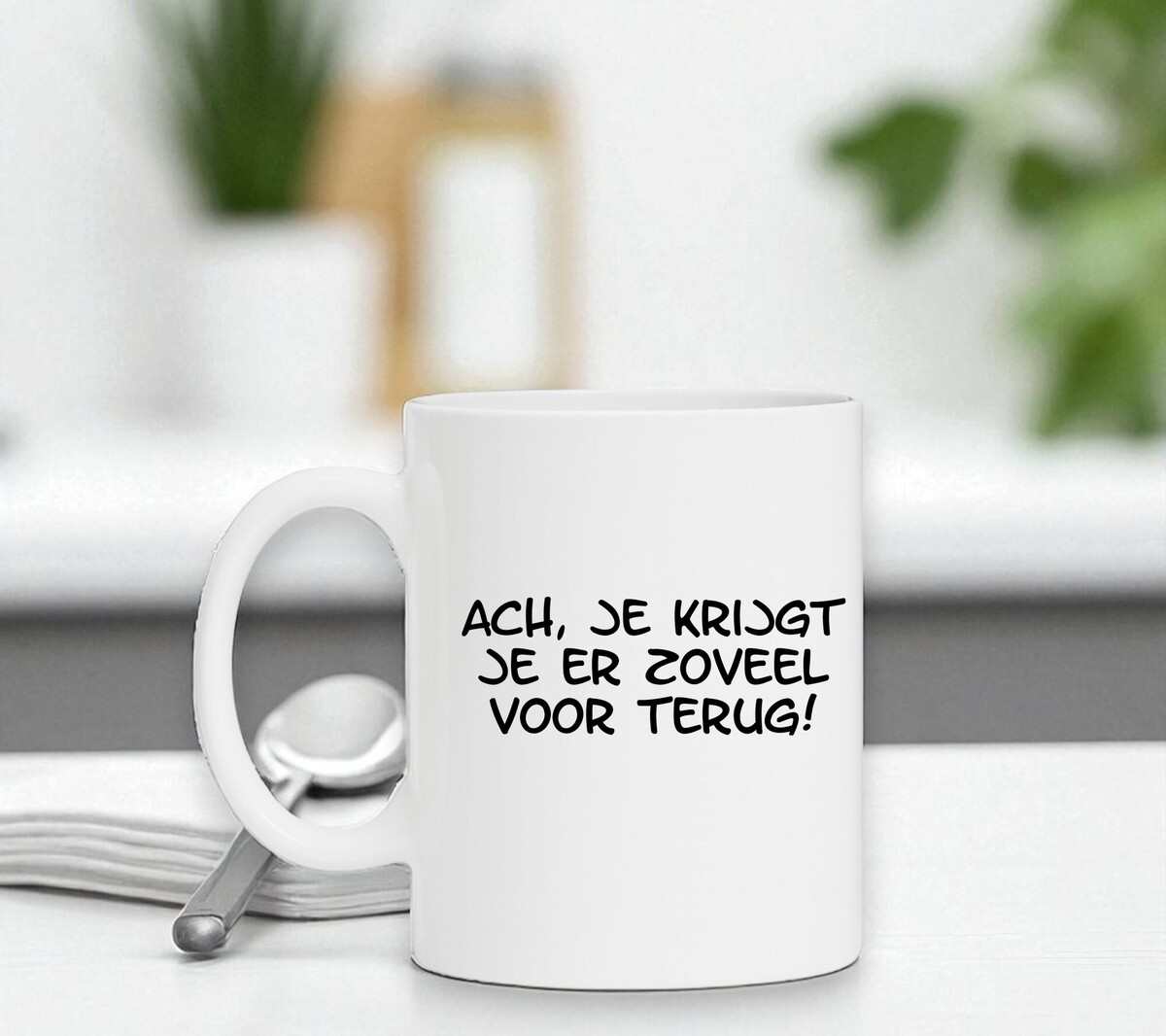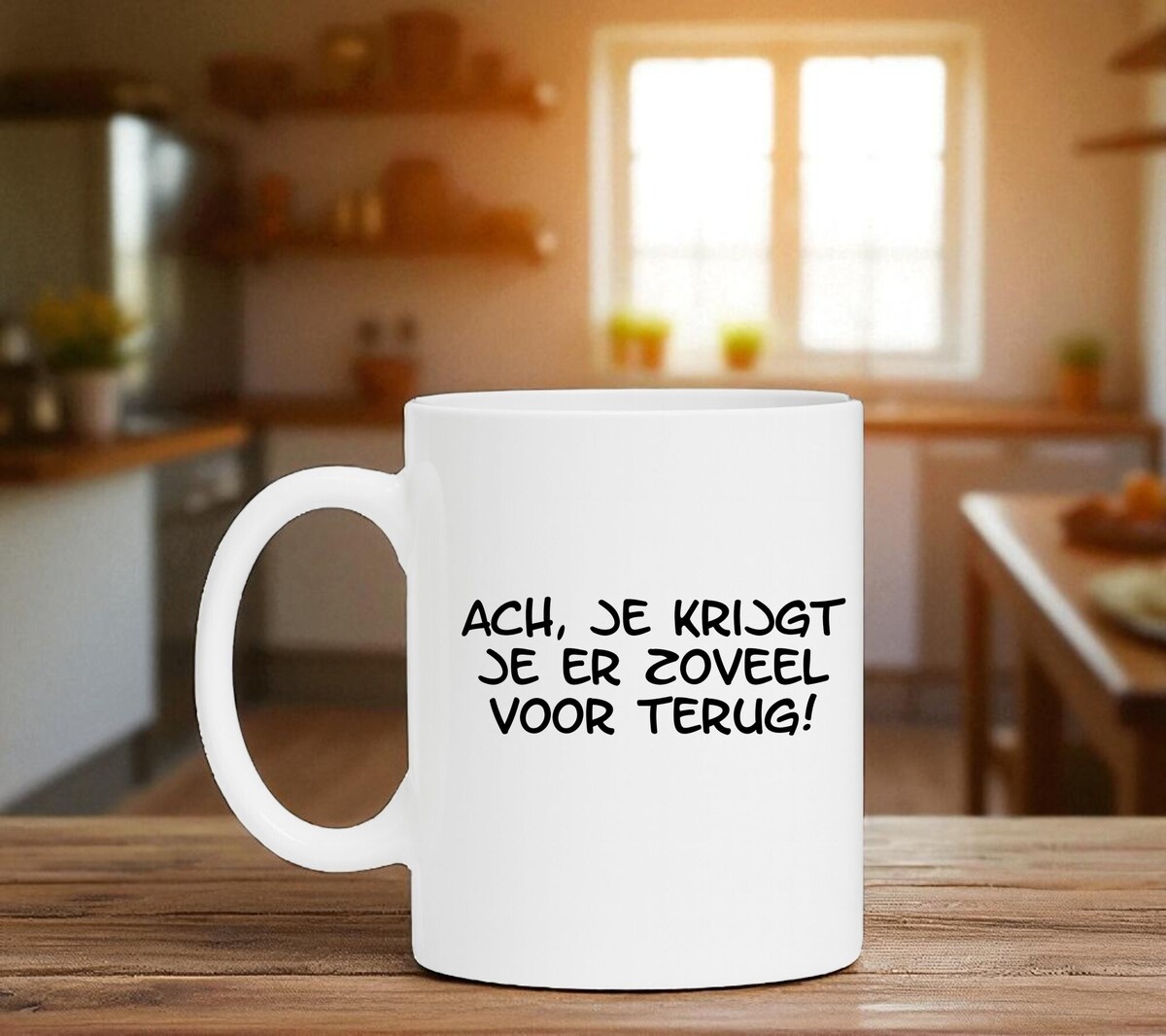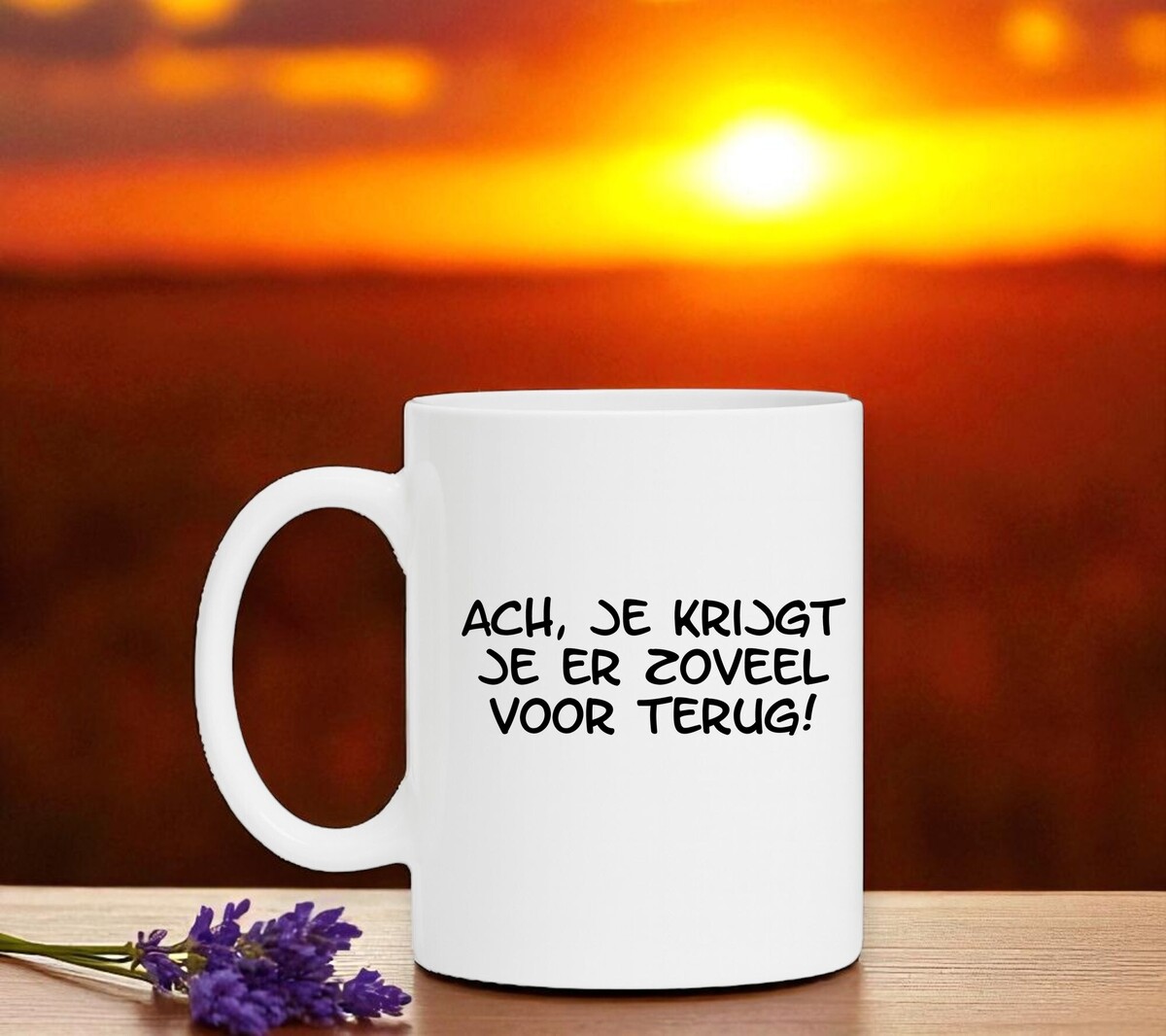 Mok Ach, je krijgt je er zóveel voor terug Grappig Vaderdag of Moederdag Kado! Deze speciale mok is een perfect cadeau voor vader- of moederdag, een kleine herinnering aan de kostbare momenten die ouders met hun kinderen delen. De mok is gemaakt van hoogwaardig keramiek en heeft een stijlvol ontwerp dat elke ochtend een glimlach op je gezicht zal toveren. Laat je geliefde ouders weten hoeveel je om ze geeft door ze deze 'Ach, gelukkig krijg je er zóveel voor terug' mok cadeau te doen. Bestel hem vandaag nog en geef ze iets speciaals om elke dag van te genieten."