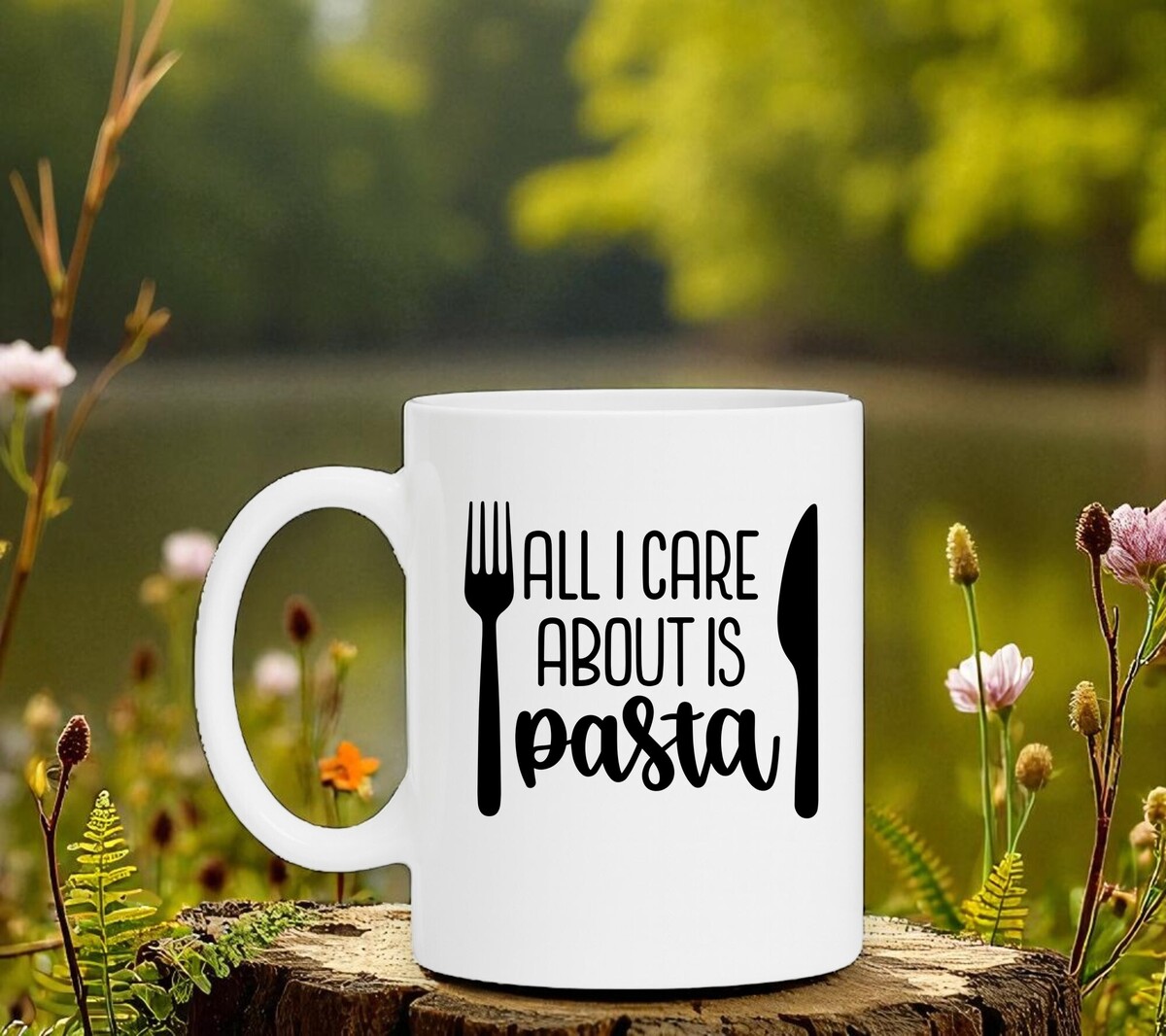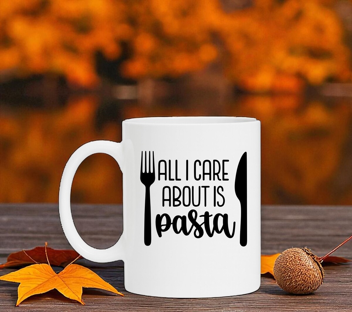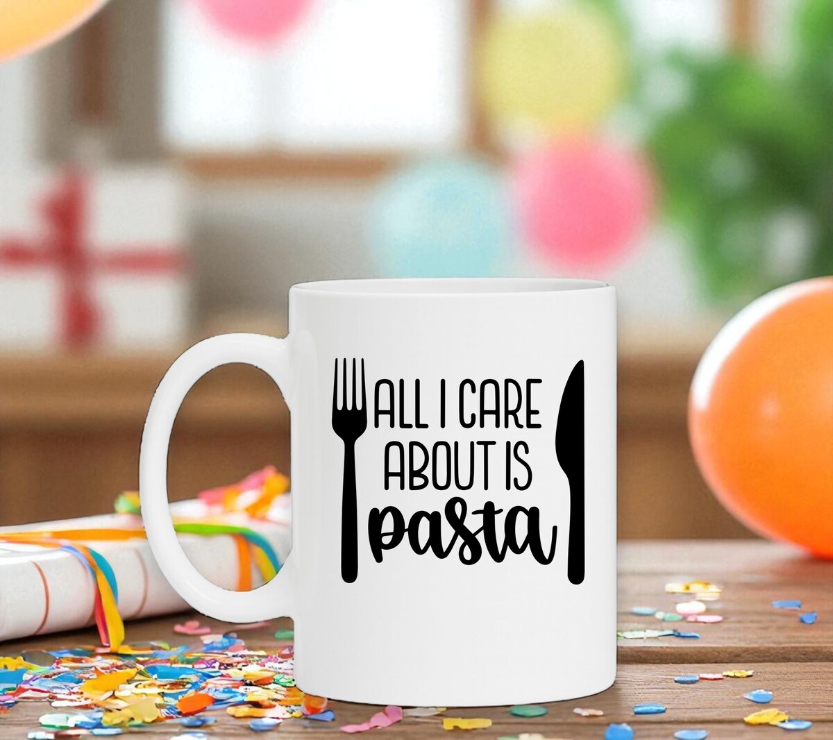 Witte koffie of the mok mok all i care about is pasta. Een leuk cadeau voor een pasta liefhebber. De mok is magnetron en vaatwasserbestendig en de witte mok heeft een hoogte van 96mm en een diameter van 80mm.