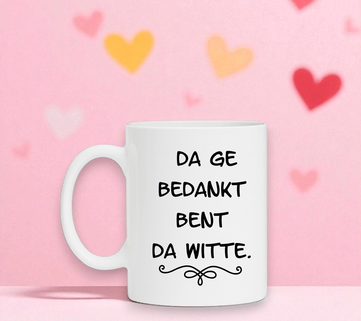 Mok bedankje cadeau in het Brabants Da ge bedankt bent da witte. De witte koffie of thee mok is vaatwasserbestendig en magnetronbestendig. De mok heeft een hoogte van 96mm en een diameter van 80mm.