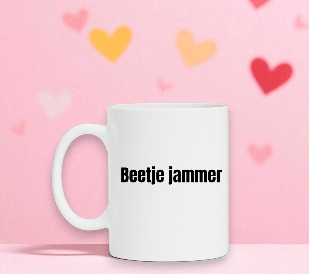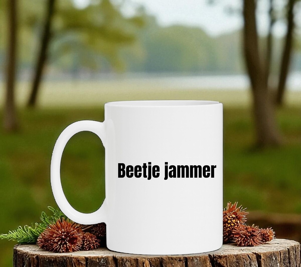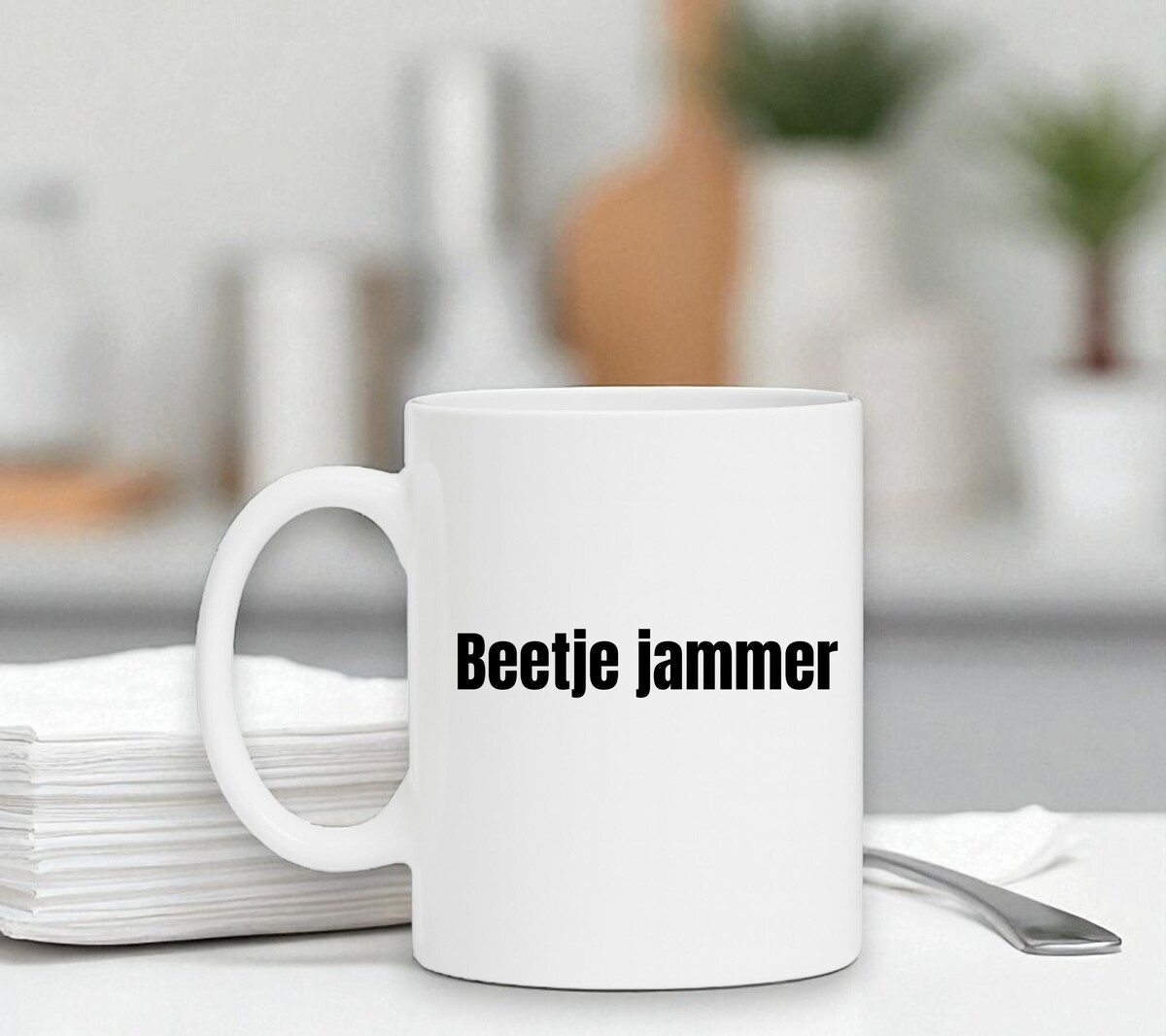 Mok Beetje jammer. De witte koffie of thee mok is vaatwasserbestendig en magnetronbestendig. De mok heeft een hoogte van 96mm en een diameter van 80mm.