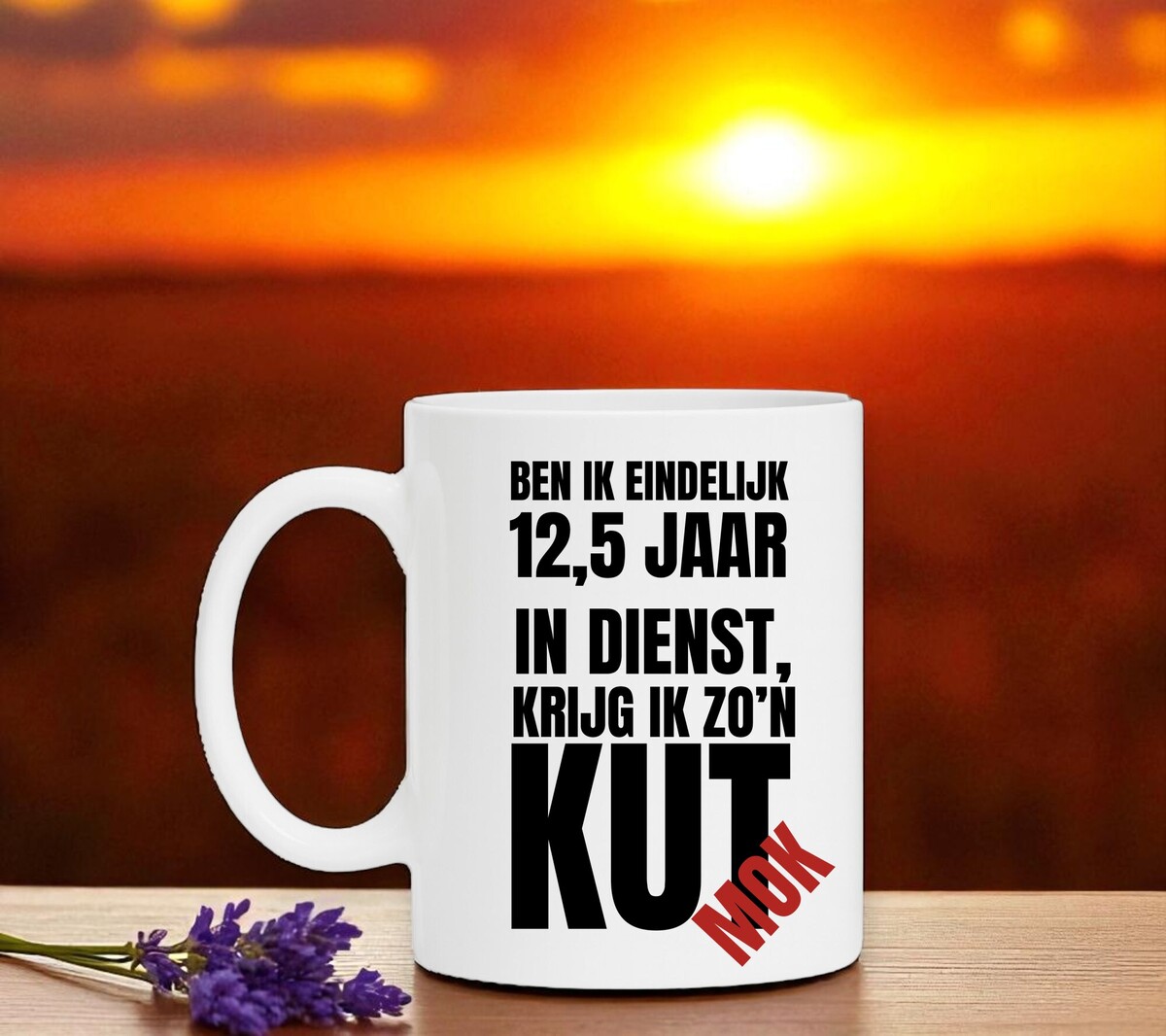Een grappige kado voor hem of haar die 12,5 jaar bij een werkgever is! Op de witte koffie of thee mok staat de opdruk Ben ik eindelijk 12,5 jaar in dienst krijg ik zo'n kut mok! De mok is magnetron en vaatwasserbestendig en de witte mok heeft een hoogte van 96mm en een diameter van 80mm.