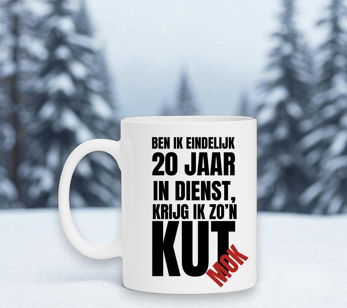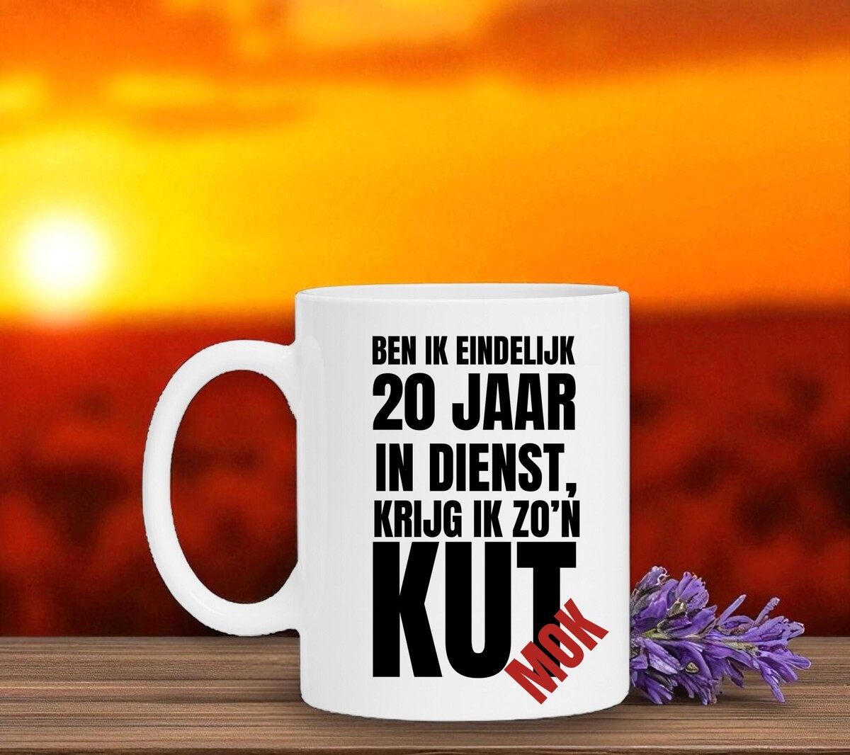 Een onwijs grappig kado voor hem of haar die 20 jaar in dienst is bij dezelfde baas. De witte koffie of thee mok is voorzien van de tekst 'Ben ik eindelijk 20 jaar in dienst krijg ik zo'n kut mok!'. De mok is magnetron en vaatwasserbestendig en de witte mok heeft een hoogte van 96mm en een diameter van 80mm.
