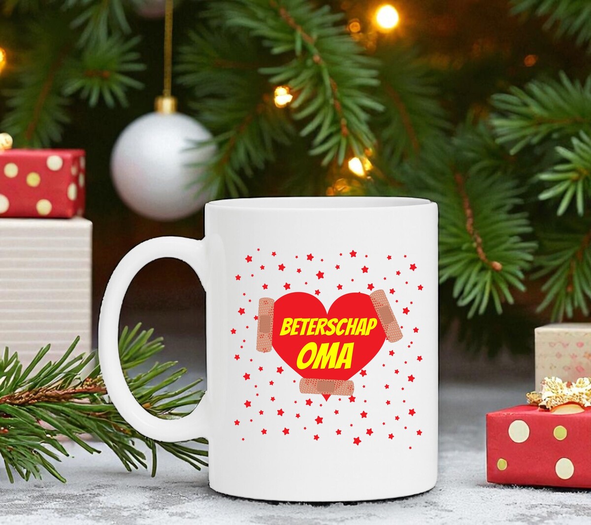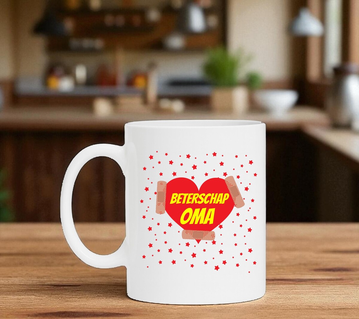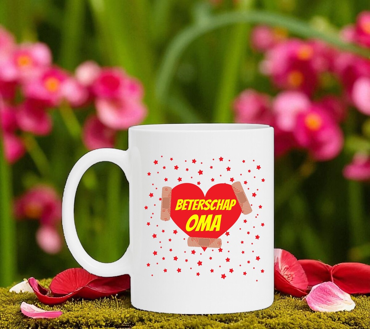Een lieve witte koffie of thee mok om je zieke oma mee betershap te wensen.