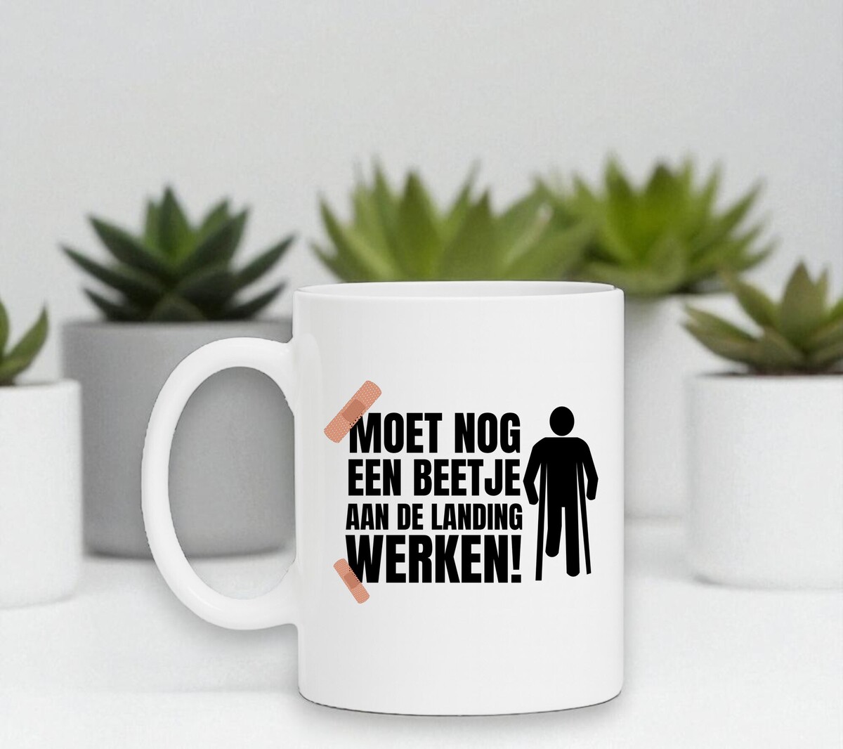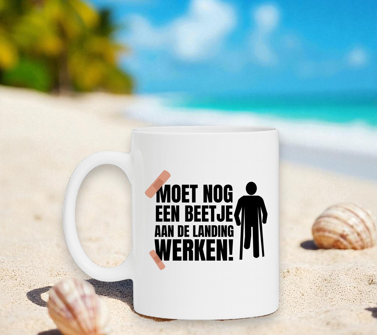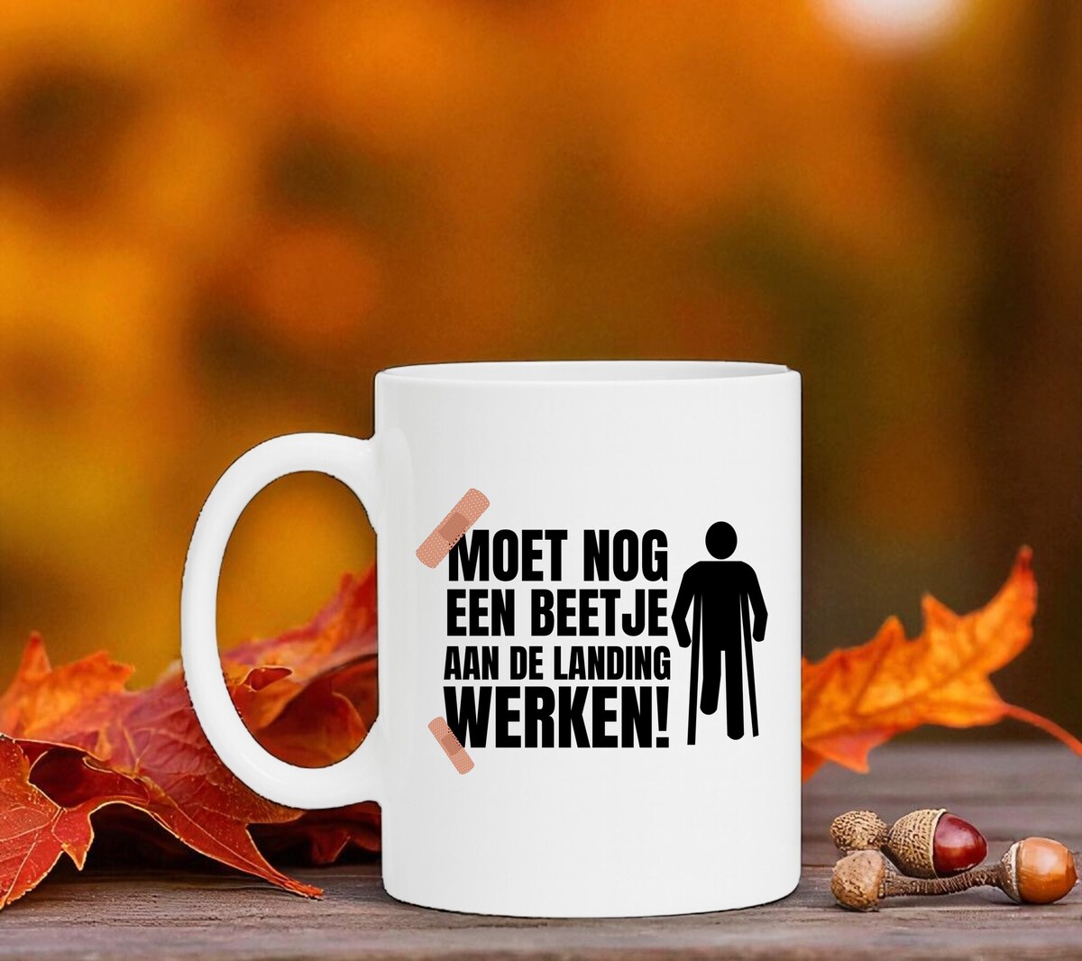 Een grappige witte koffie of thee mok voor hem of haar die is gevallen. Op de mok staat de tekst 'Moet nog een beetje aan de landing werken!'