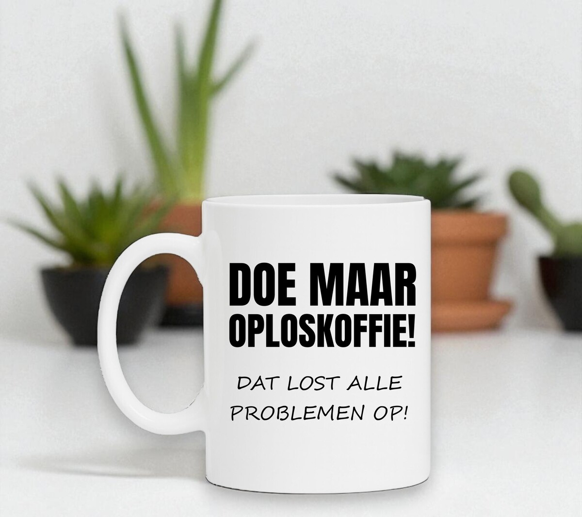 Een grappige, gekke koffie mok. Met de opdruk 'Doe maar oploskoffie! Dat lost alle problemen op!'. De mok is magnetron en vaatwasserbestendig en de witte mok heeft een hoogte van 96mm en een diameter van 80mm.