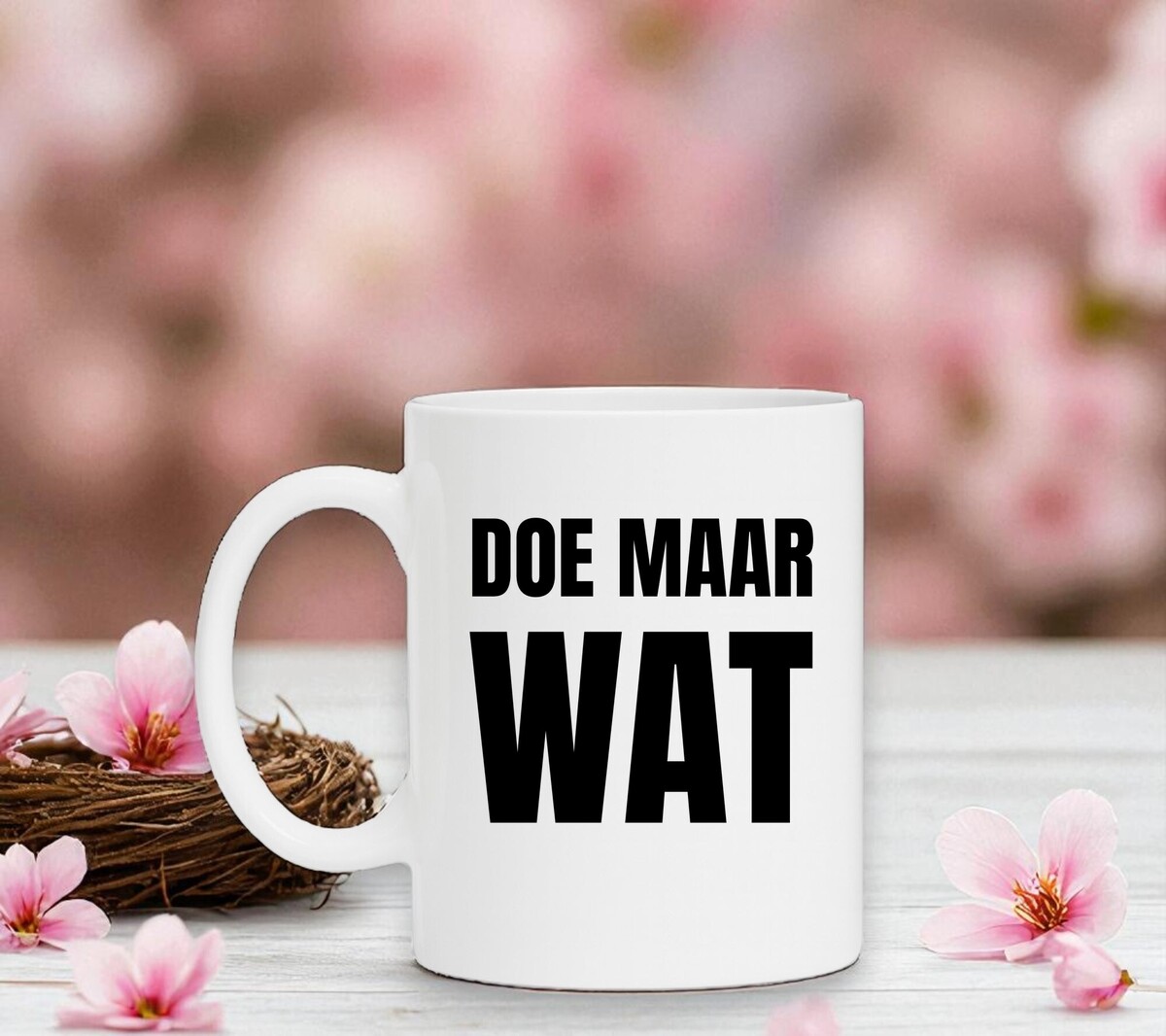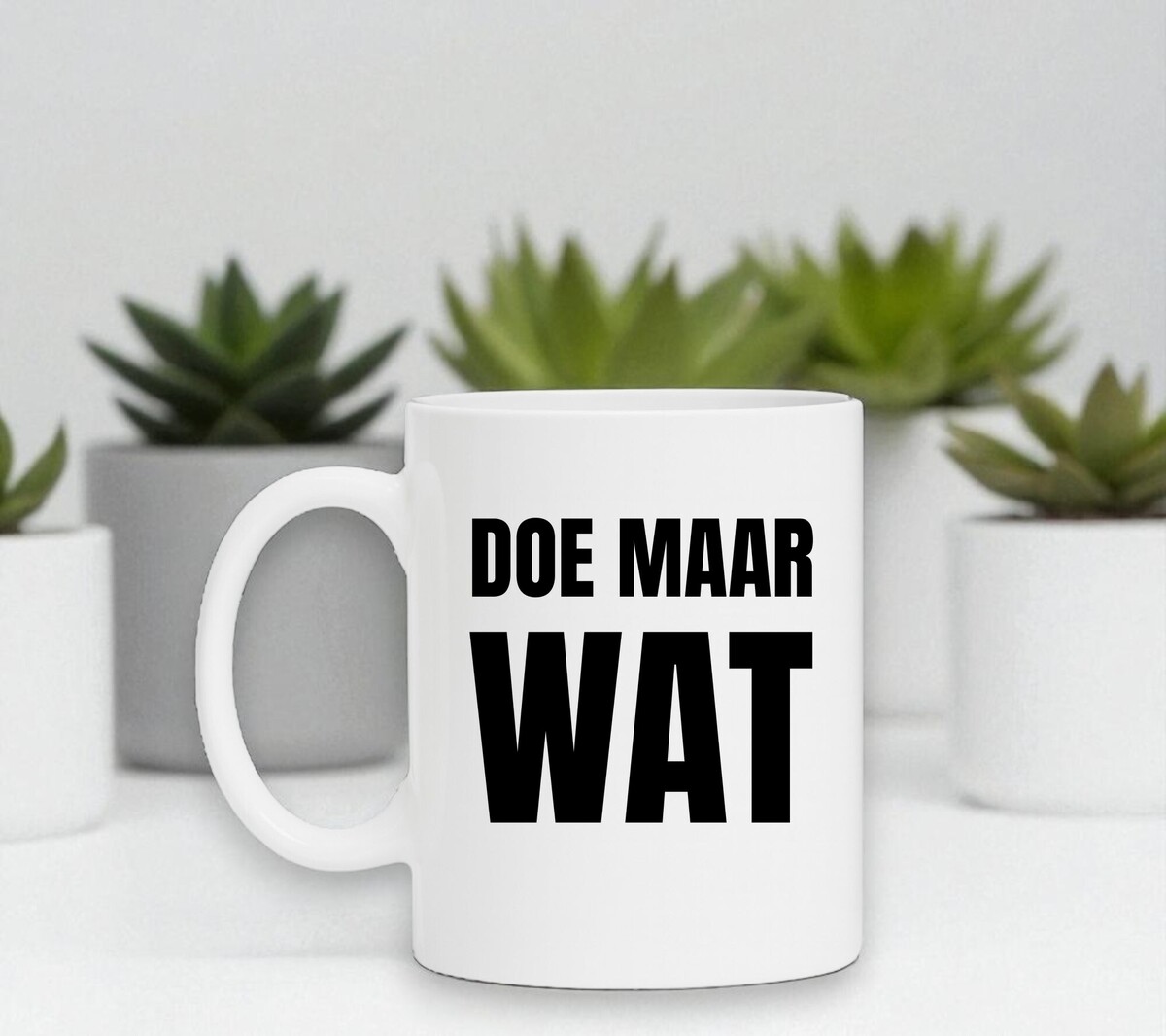 Witte mok met de opdruk doe maar wat. De mok is vaatwasserbestendig en magnetronbestendig. De mok heeft een hoogte van 96mm en een diameter van 80mm