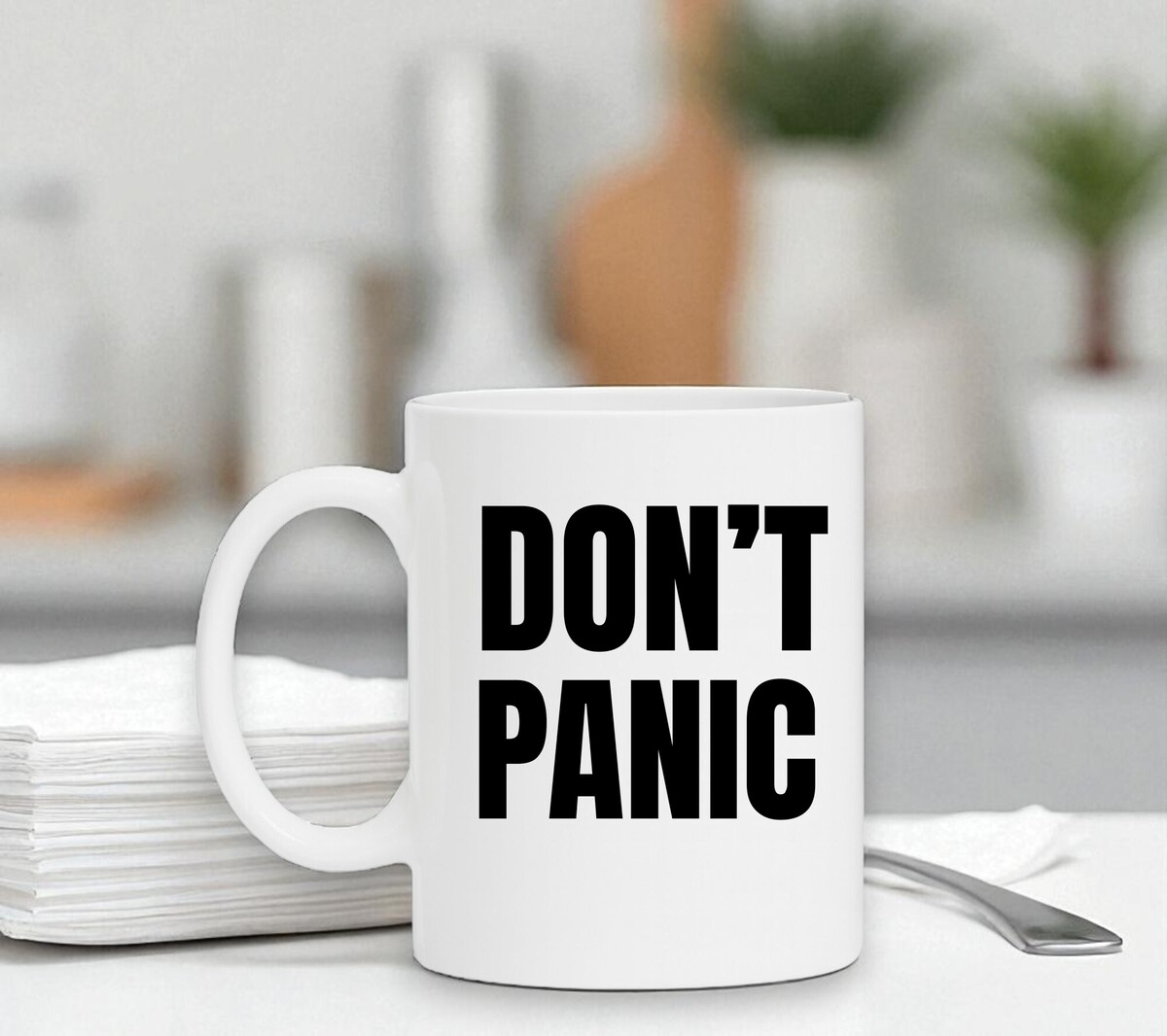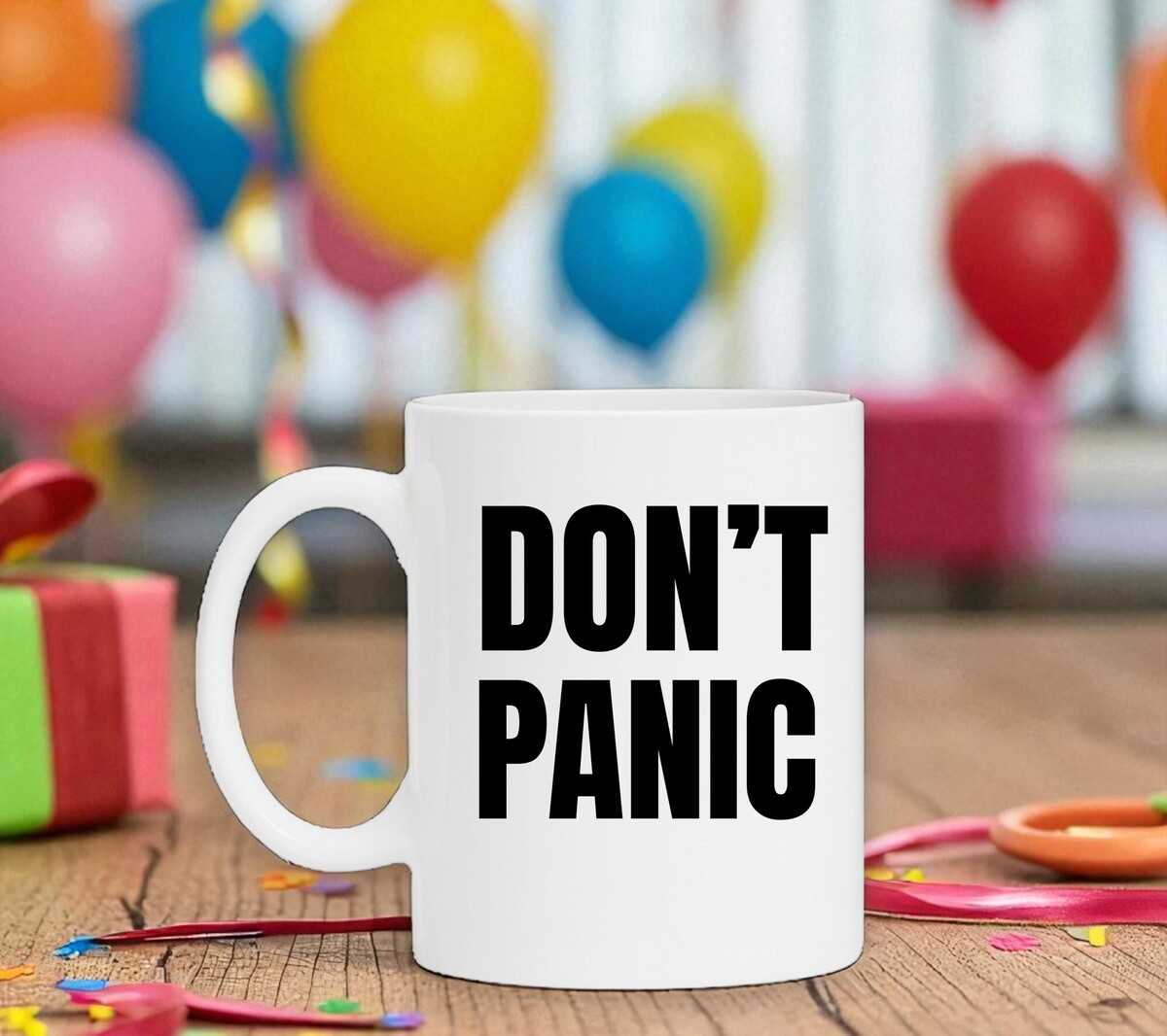 Mok don't panic geen paniek! De witte koffie of thee mok is vaatwasserbestendig en magnetronbestendig. De mok heeft een hoogte van 96mm en een diameter van 80mm.