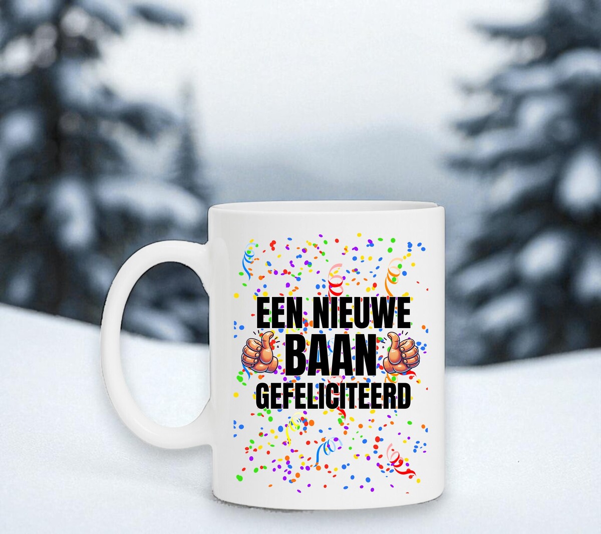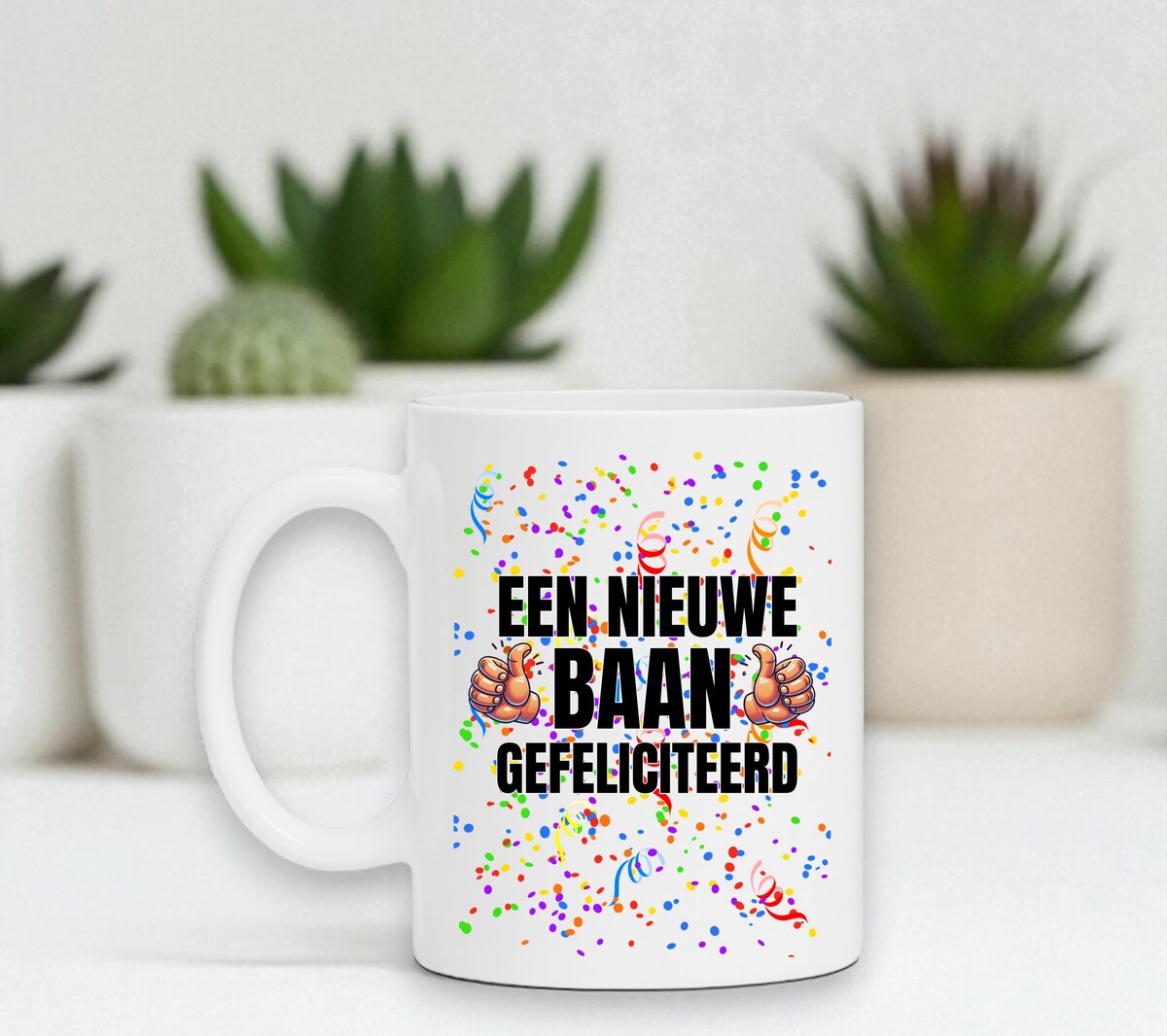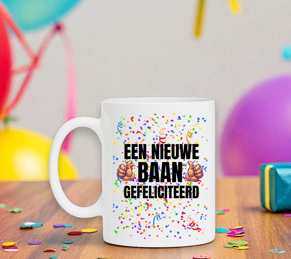 Een feestelijke koffie of thee mok om hem of haar te feliciteren met zijn of haar nieuwe baan! De mok is magnetron en vaatwasserbestendig en de witte mok heeft een hoogte van 96mm en een diameter van 80mm.