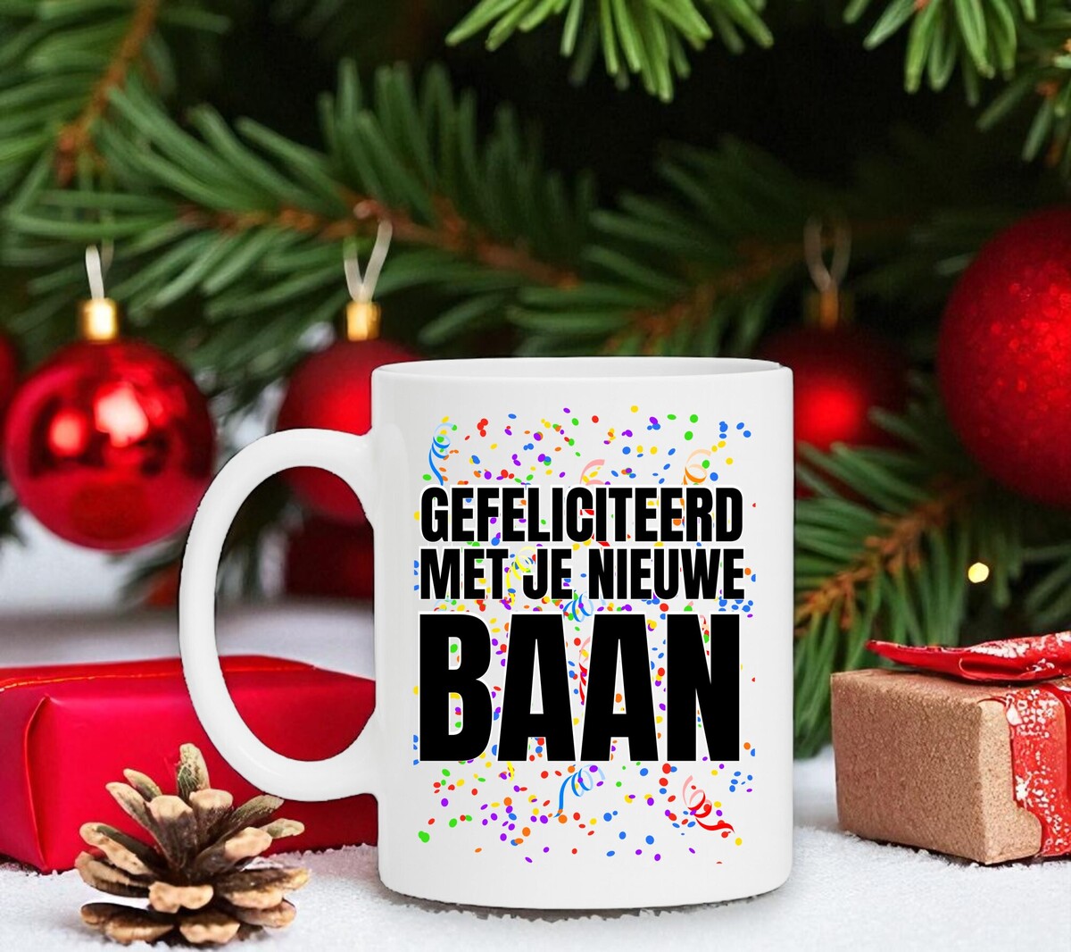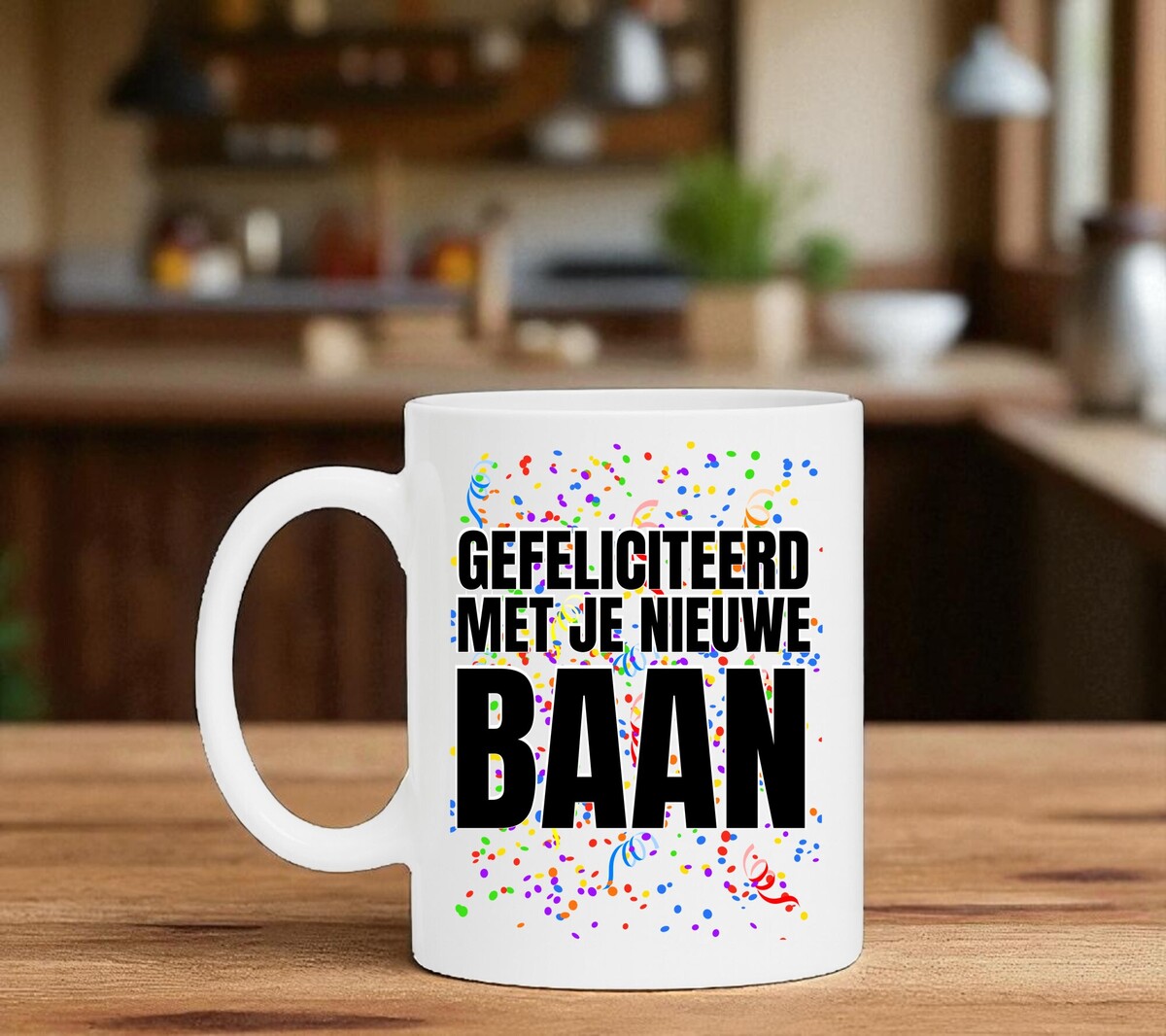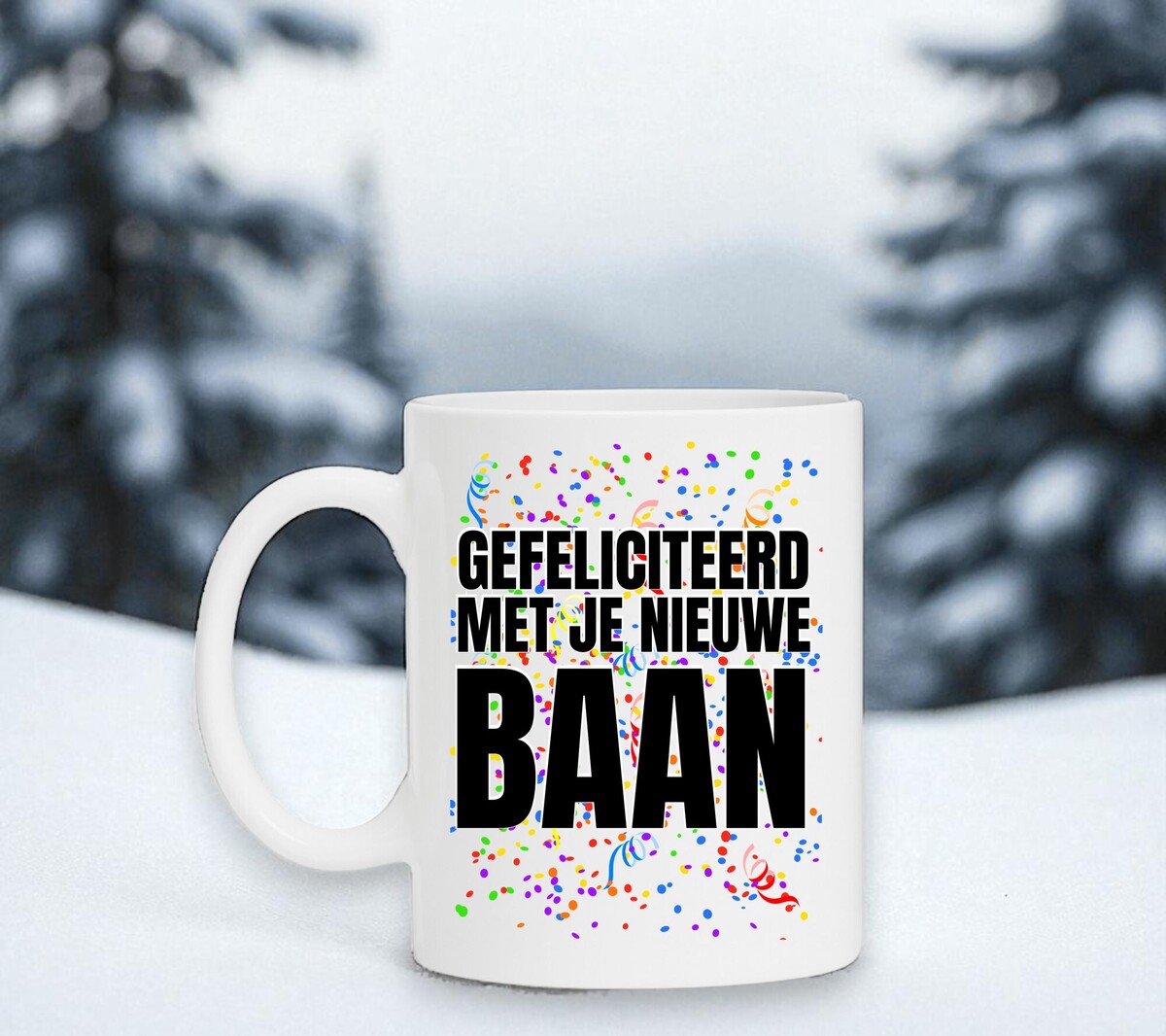 Een leuk en feestelijke koffie of thee mok om cadeau te geven voor hem of haar die een nieuwe baan heeft! 'Gefelciteerd met je nieuwe baan'. De mok is magnetron en vaatwasserbestendig en de witte mok heeft een hoogte van 96mm en een diameter van 80mm.