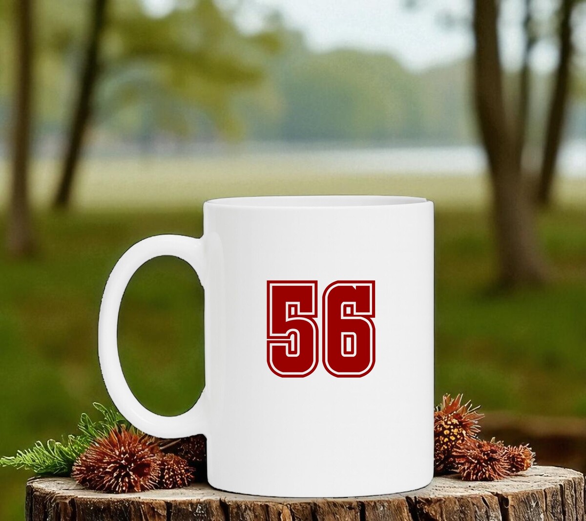 Mok getal 56 opdruk in de prachtige kleur robijnrood. Hoogte mok 9cm.