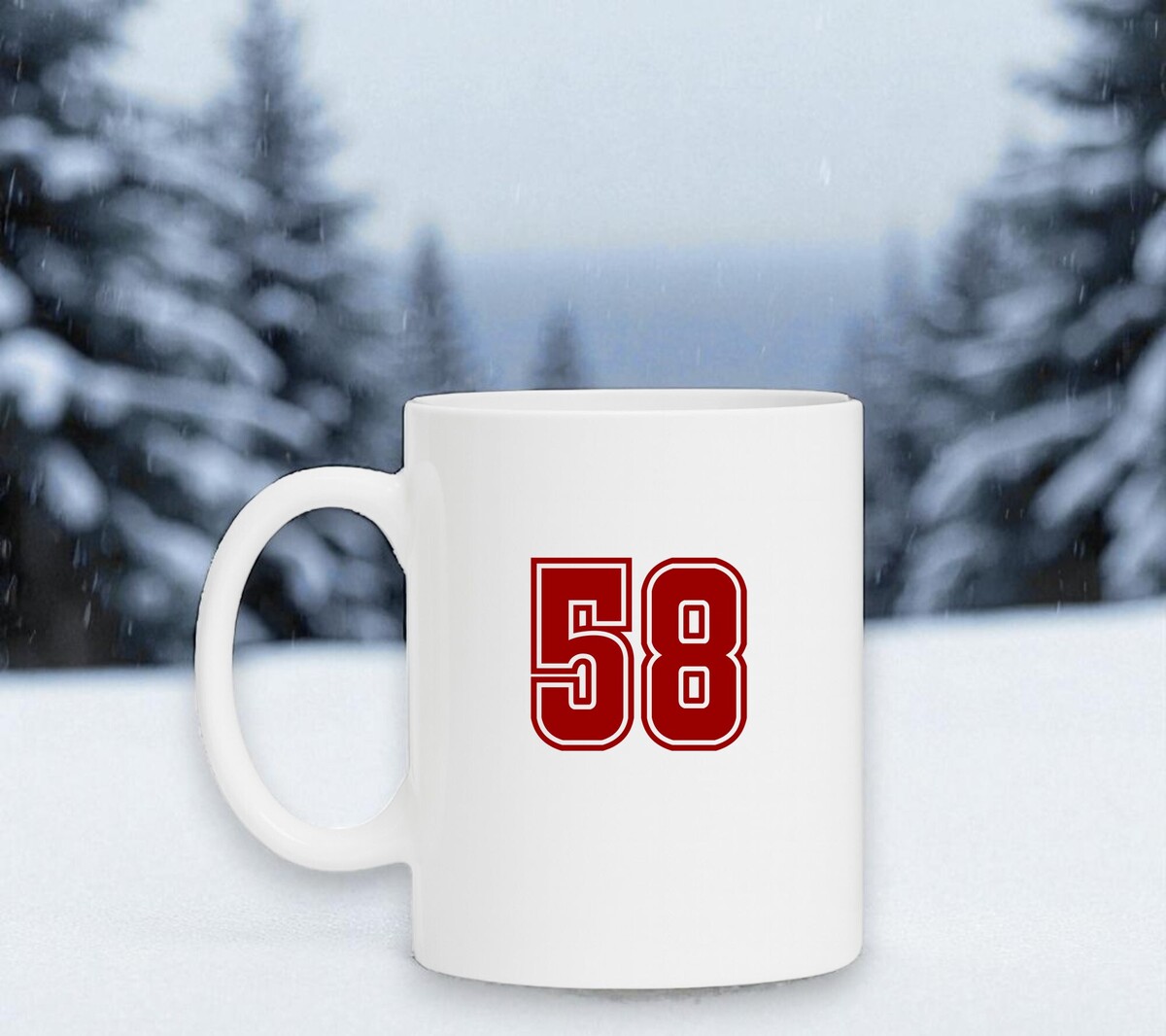 Een witte mok met het getal 58 erop gedrukt.
