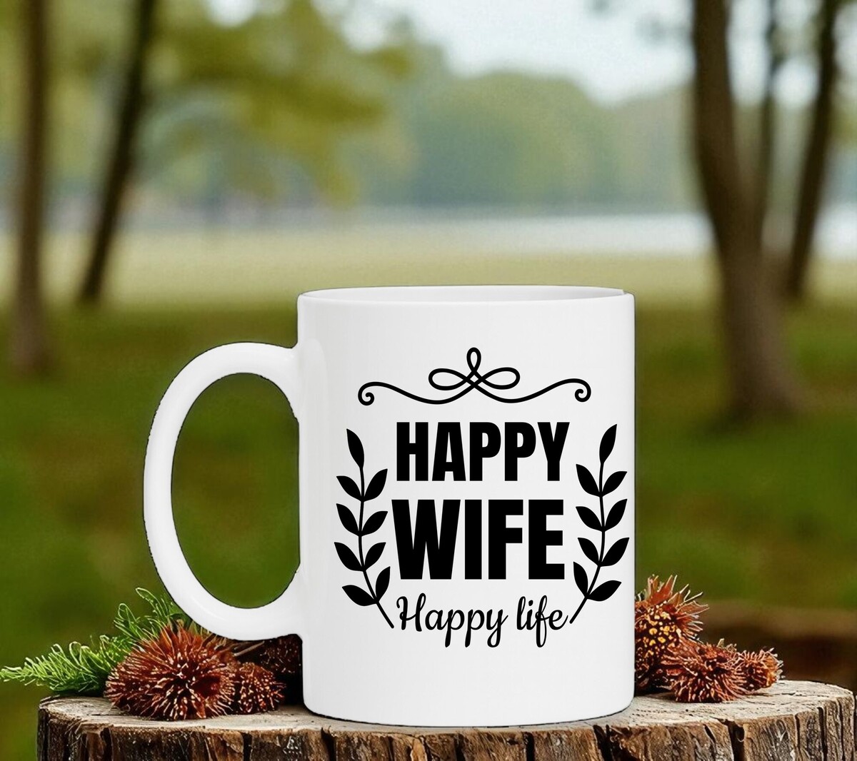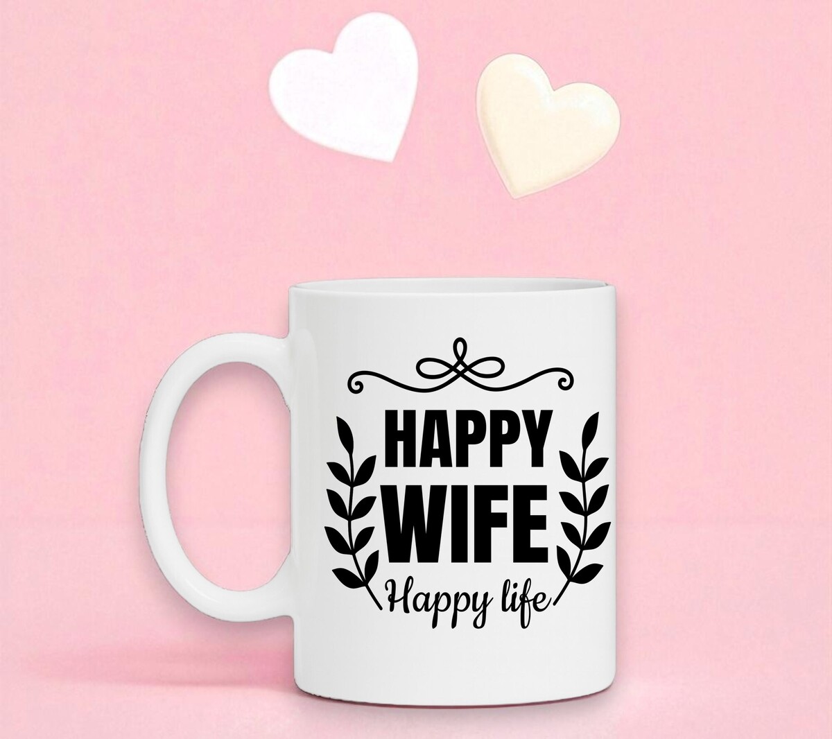 Een grappig koffie of thee mok happy wife happy life! De mok is magnetron en vaatwasserbestendig en de witte mok heeft een hoogte van 96mm en een diameter van 80mm.
