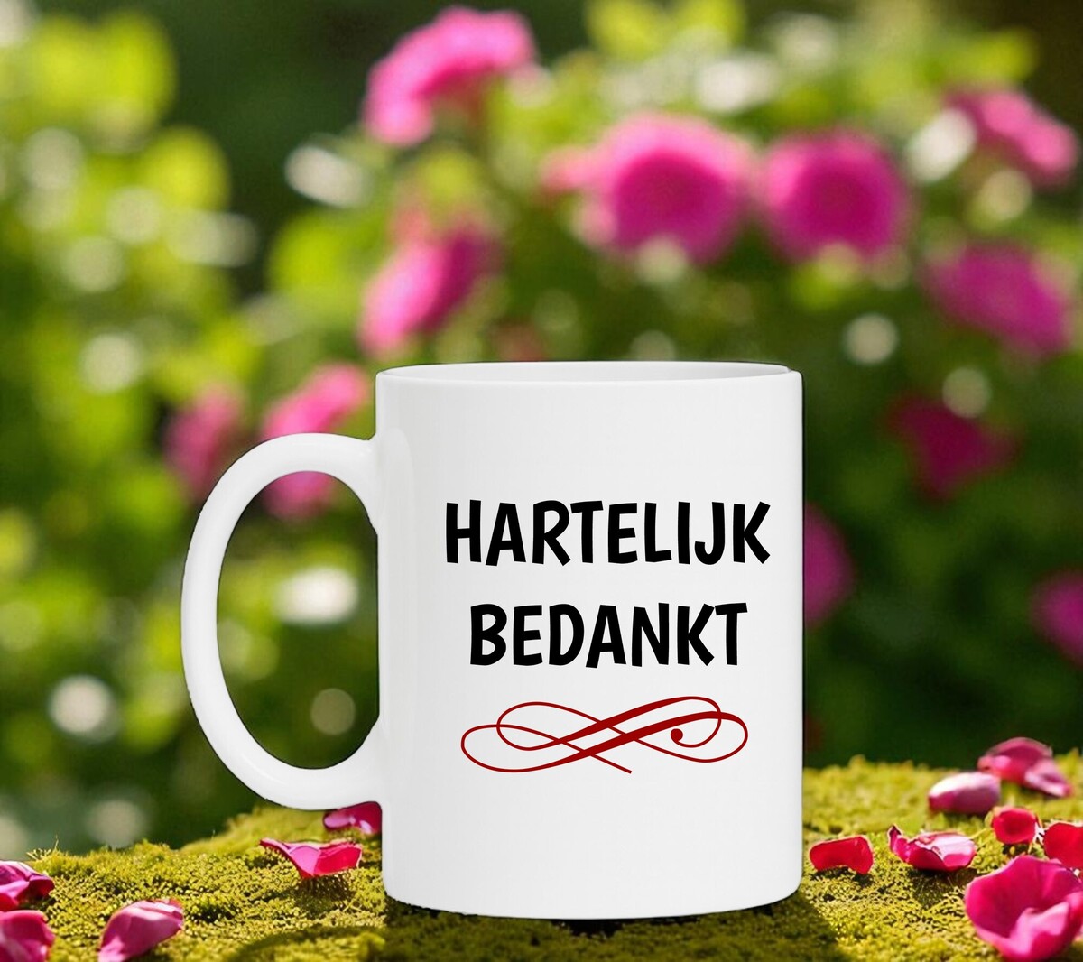 Een leuke manier om hem of haar te bedanken voor een geleverde dienst! Op de witte koffie of thee mok staat de opdruk Hartelijk bedankt. De mok is magnetron en vaatwasserbestendig en de witte mok heeft een hoogte van 96mm en een diameter van 80mm.