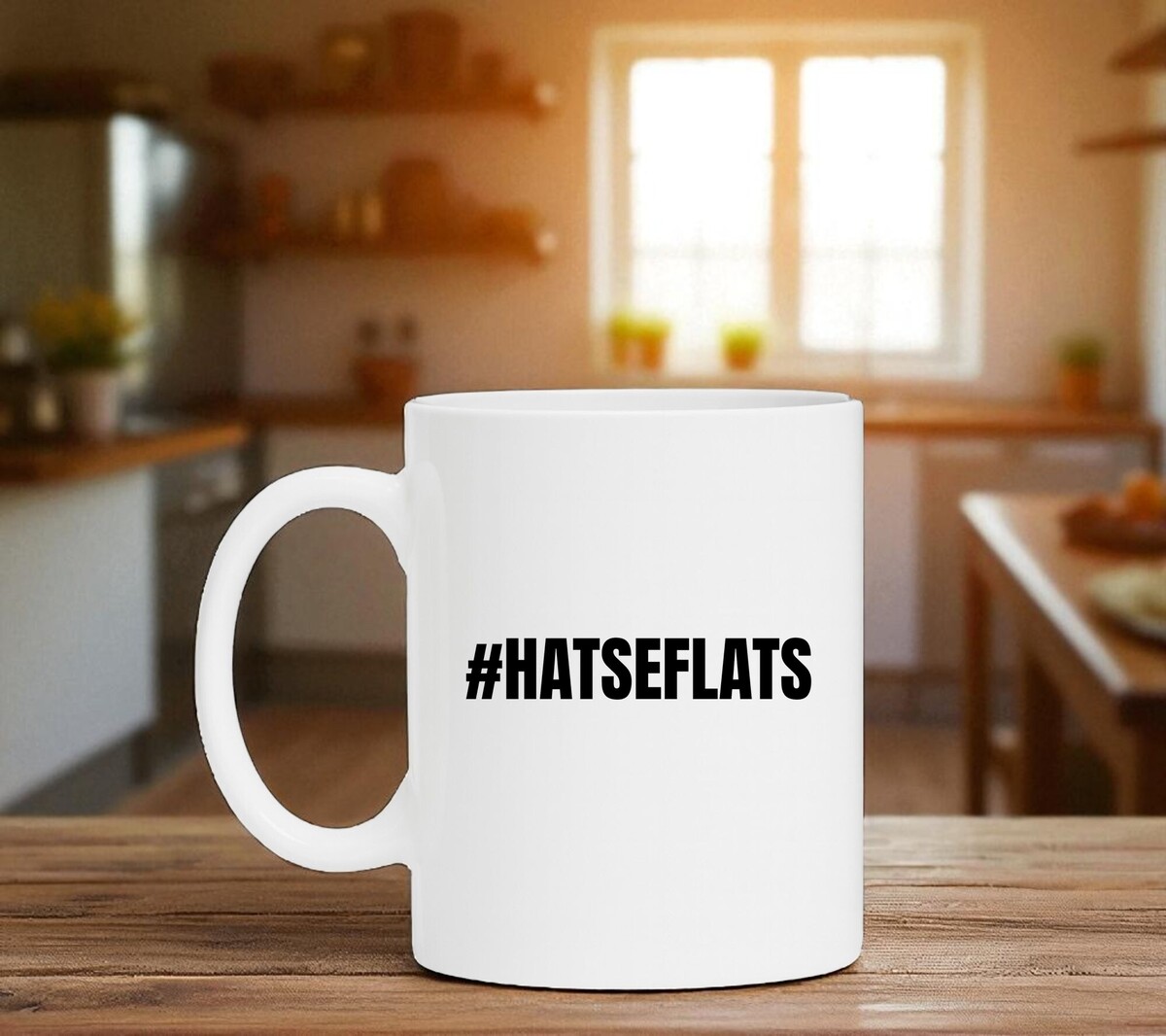 Een witte koffie of thee mok met de opdruk #hatseflats. De mok is magnetron en vaatwasserbestendig en de witte mok heeft een hoogte van 96mm en een diameter van 80mm.