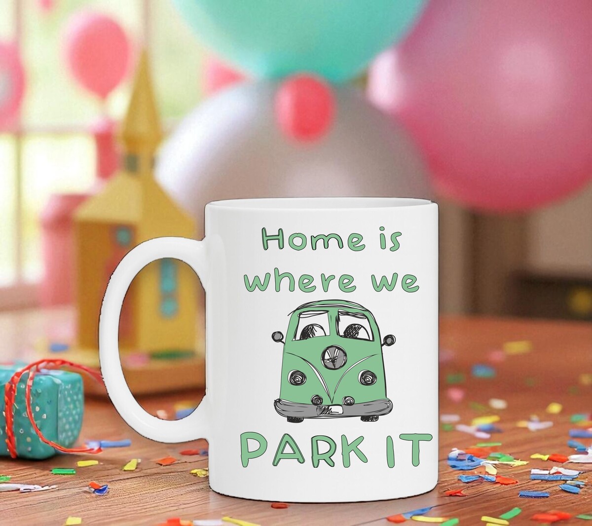Koffie mok home is where we park the Volkswagen Transporter Oldtimer. De witte koffie of thee mok is vaatwasserbestendig en magnetronbestendig. De mok heeft een hoogte van 96mm en een diameter van 80mm.