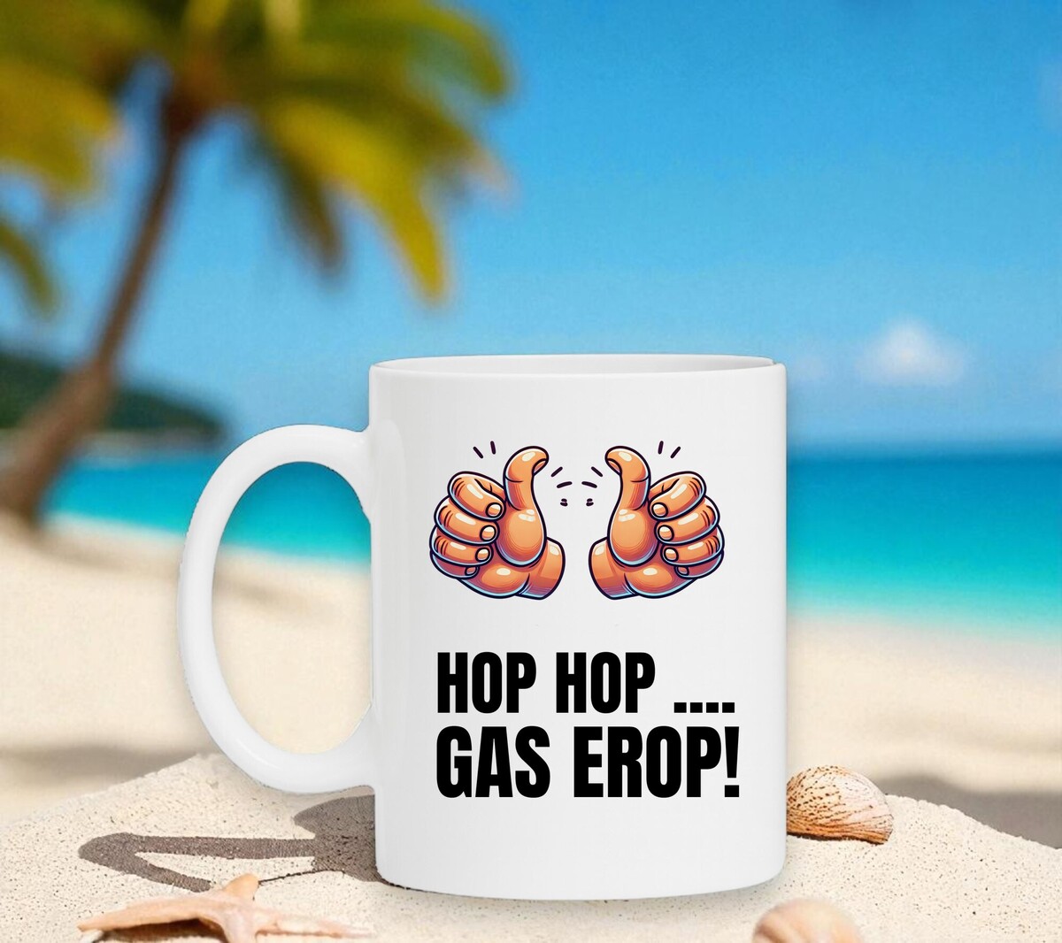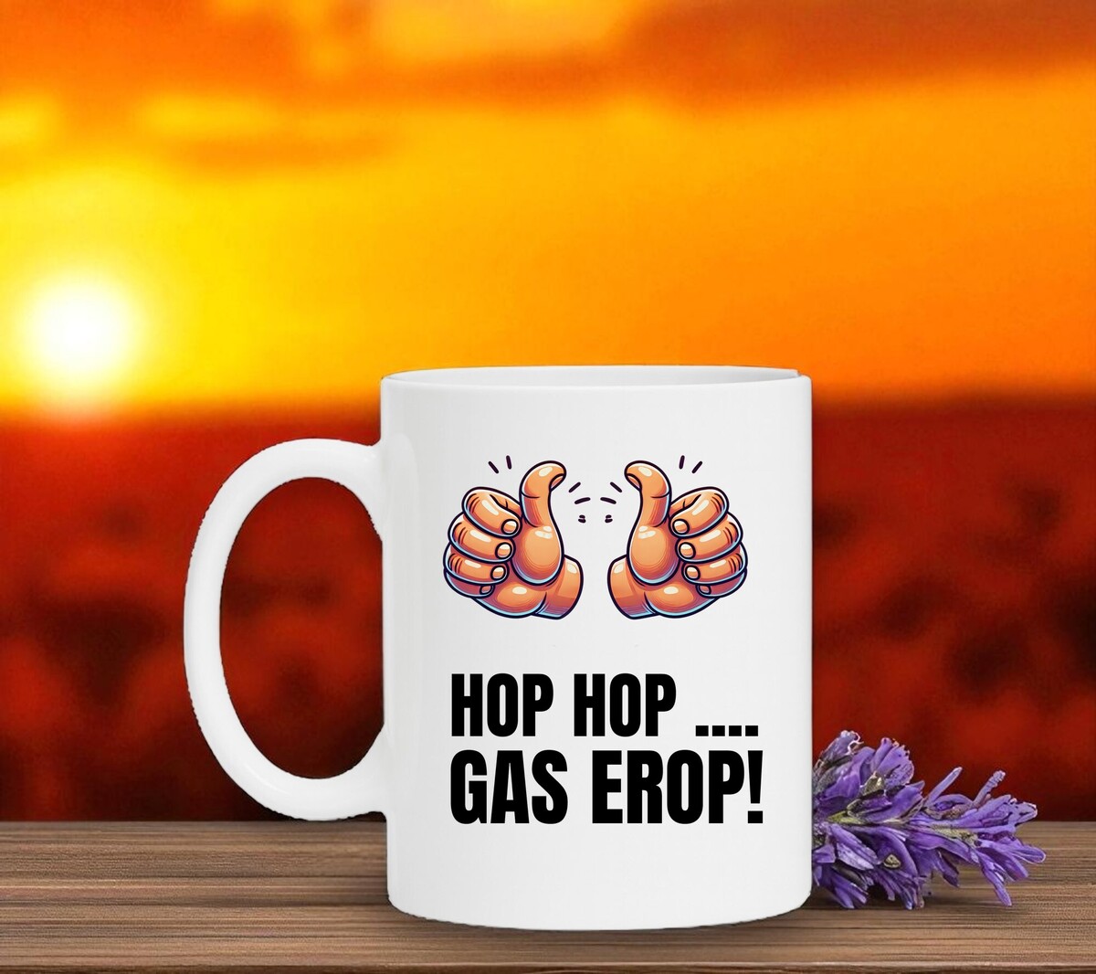 Begin je dag met een glimlach (en een beetje snelheid)! Deze vrolijke en grappige mok is perfect voor iedereen die van koffie, thee én een beetje pit houdt.