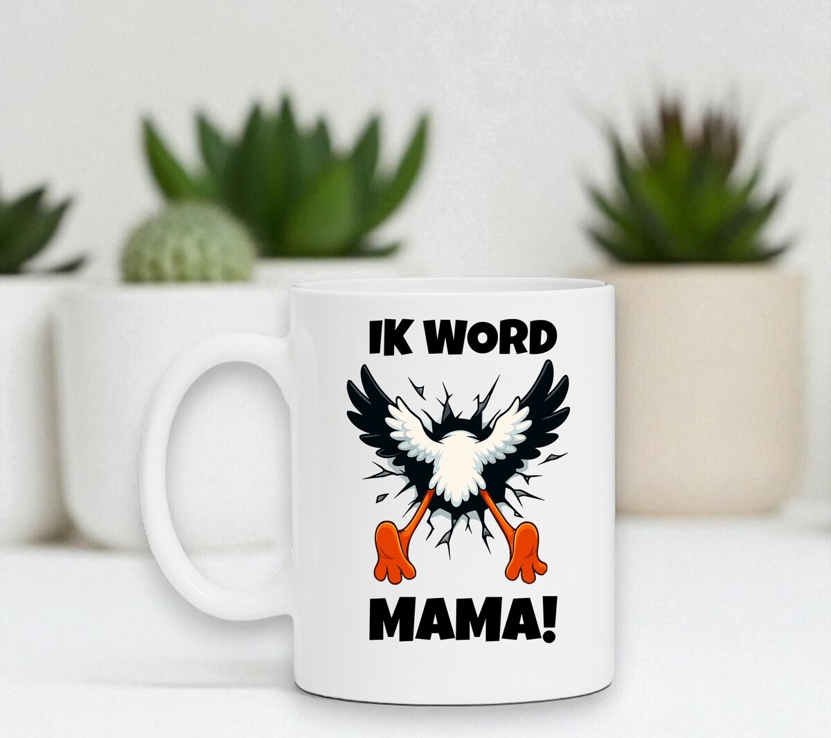 Vier het mooiste nieuws op een liefdevolle en unieke manier met deze schattige “Ik word mama”-mok. De vrolijke cartoon-ooievaar die lijkt alsof hij dwars door de mok heen vliegt, geeft het ontwerp een speelse en hartverwarmende uitstraling die elke aanstaande mama laat stralen.