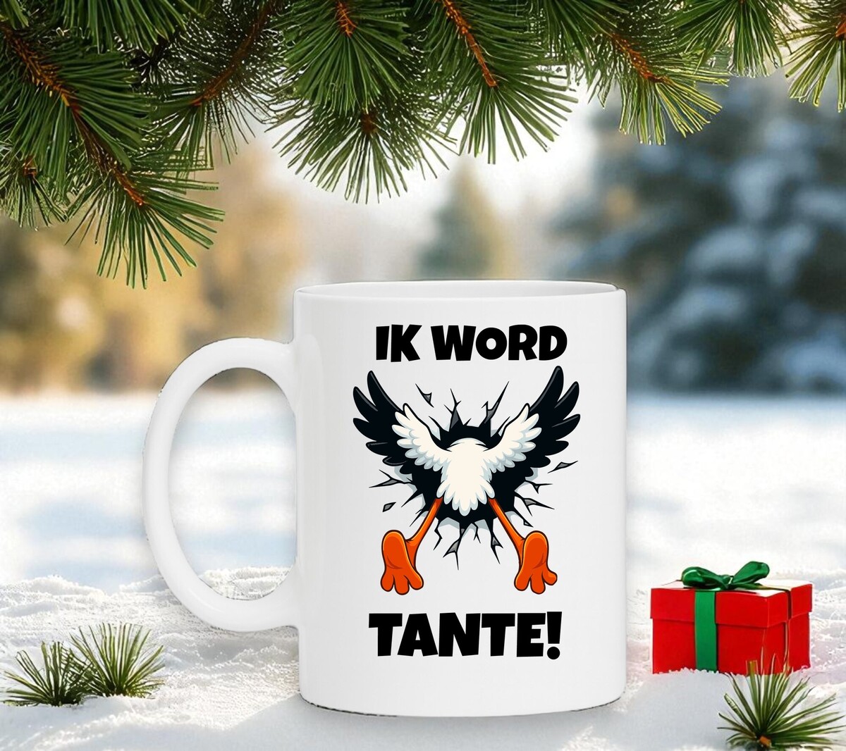 Met deze charmante “Ik word tante”-mok wordt het aankondigen van een nieuw familielid een warm en onvergetelijk moment. De speelse cartoon-ooievaar die lijkt alsof hij dwars door de mok heen vliegt, geeft het ontwerp een vrolijke en verrassende uitstraling die elke toekomstige tante meteen doet glimlachen.