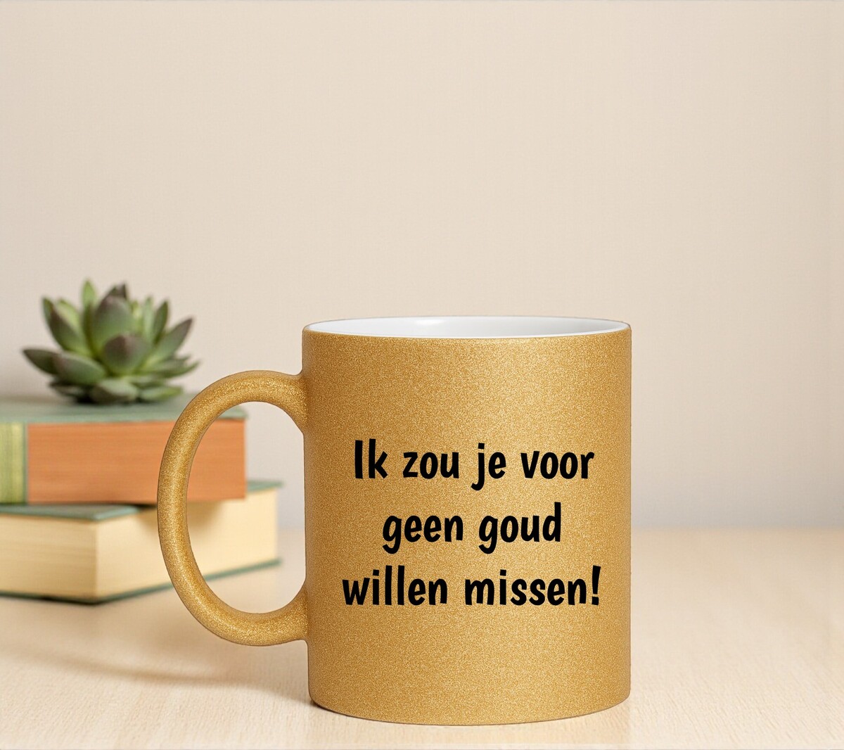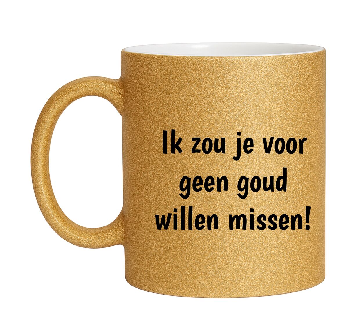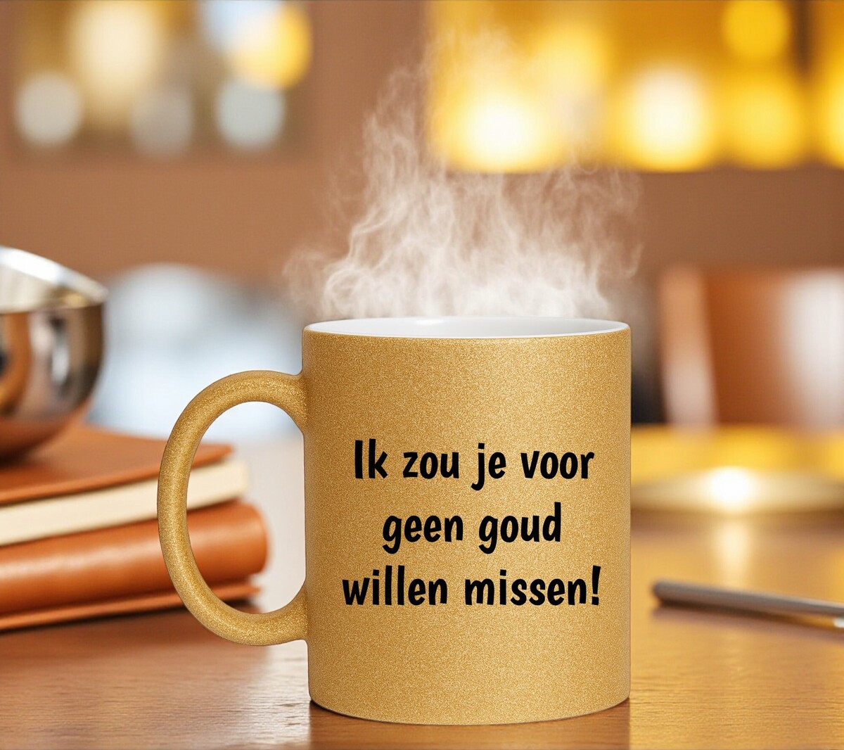 Een hele mooie glitter gouden koffie of thee mok met de toepasselijke tekst op de mok 'Ik zou je voor geen goud willen missen!'. Een super leuk valentijn cadeau! Maar ook Moederdag, Vaderdag, verjaardag cadeau! Handwas aanbevolen! Microgolfbestendig De gouden glitter mok heeft een hoogte van 96mm en een diameter van 80mm. De mok is gemaakt van wit keramiek en is aan de buitenkant volledig bedekt met gouden glitters.