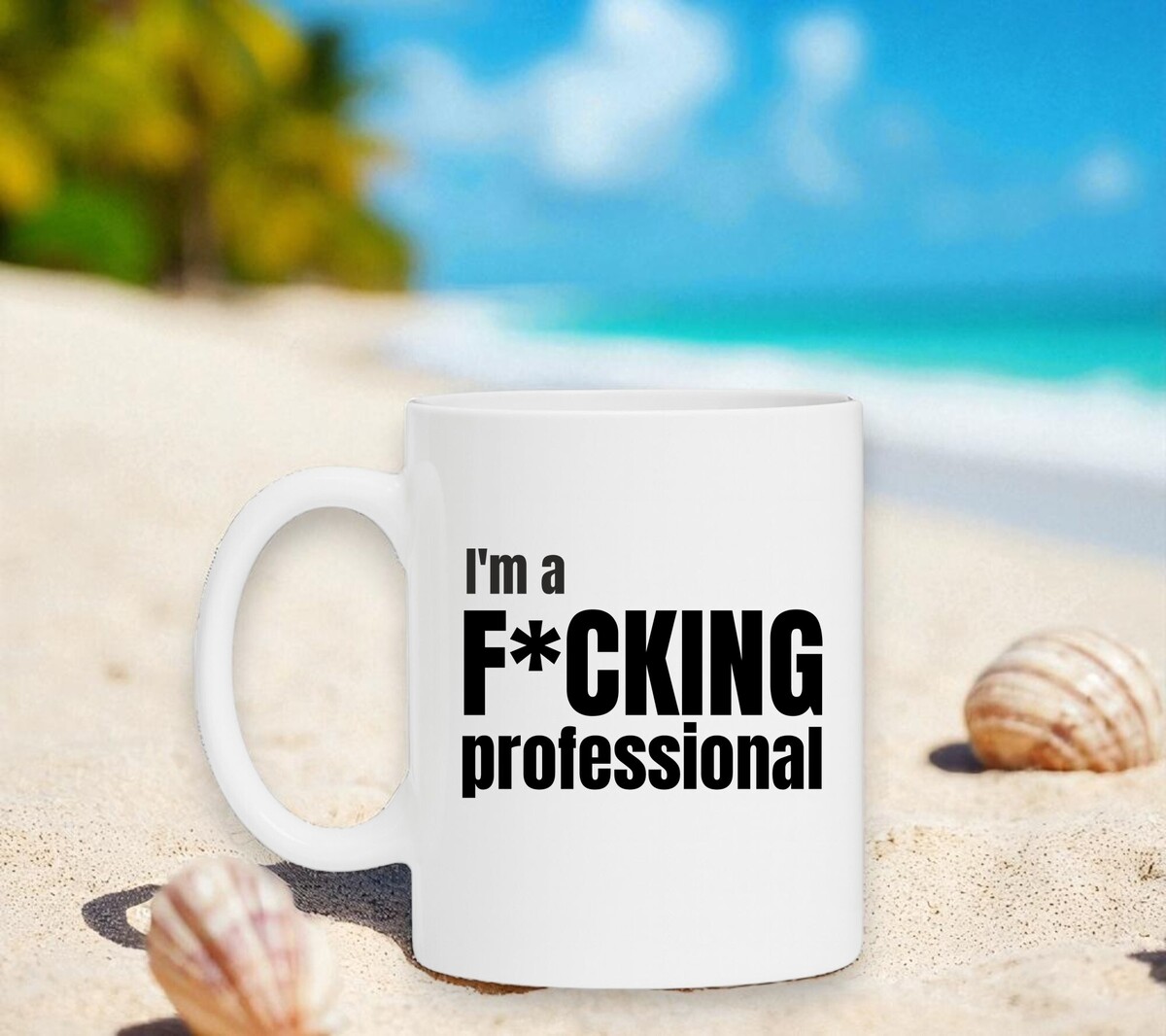 Een grappige witte koffiemok voor op het werk 'i'm a f*cking professional'.