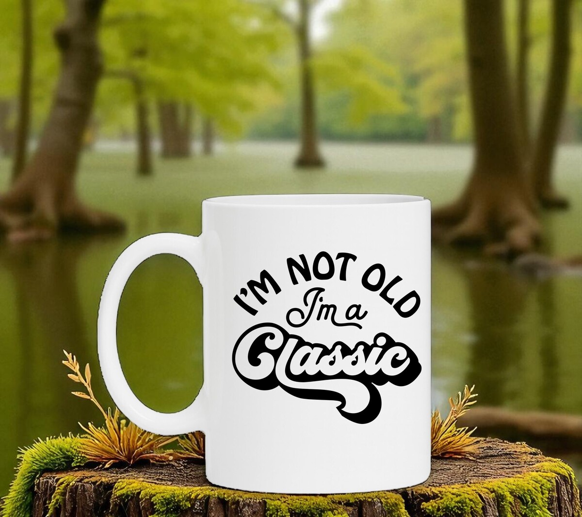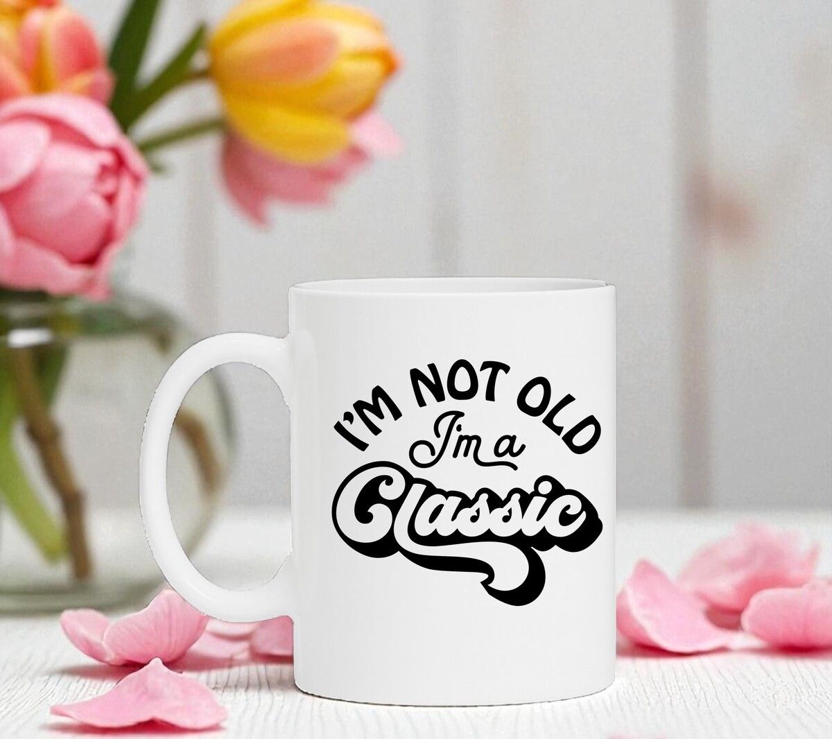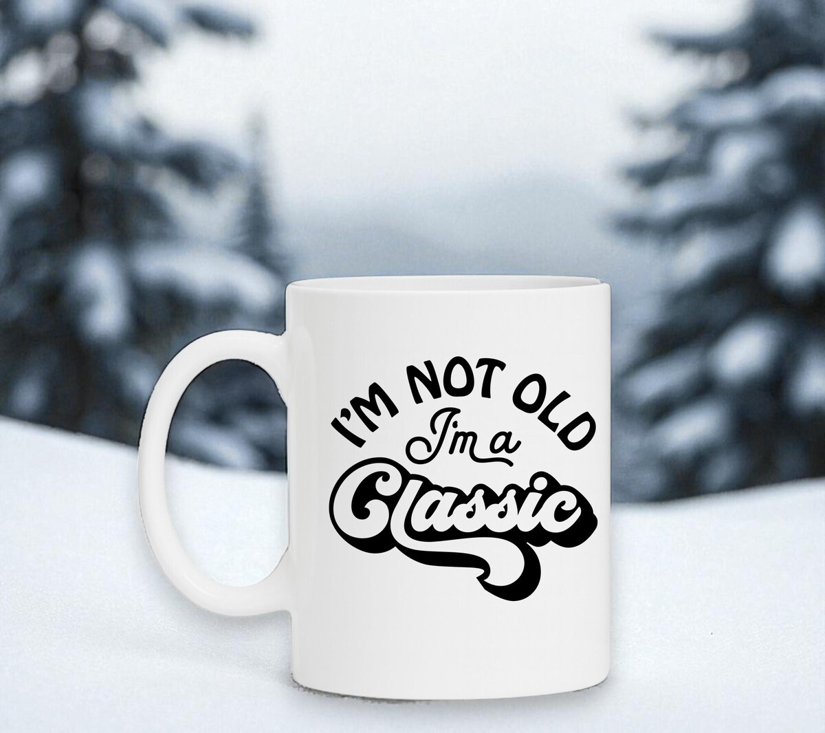 Witte koffie of thee mok I'm not old I'm a Classic (ik ben niet oud ik ben een klassieker) Een leuk verjaardags cadeau of cadeau te geven aan hem of haar die met pensioen gaat! De witte koffie of thee mok is vaatwasserbestendig en magnetronbestendig. De mok heeft een hoogte van 96mm en een diameter van 80mm.