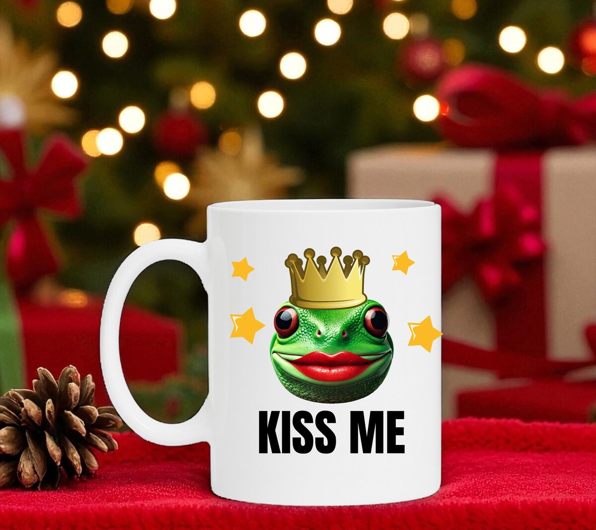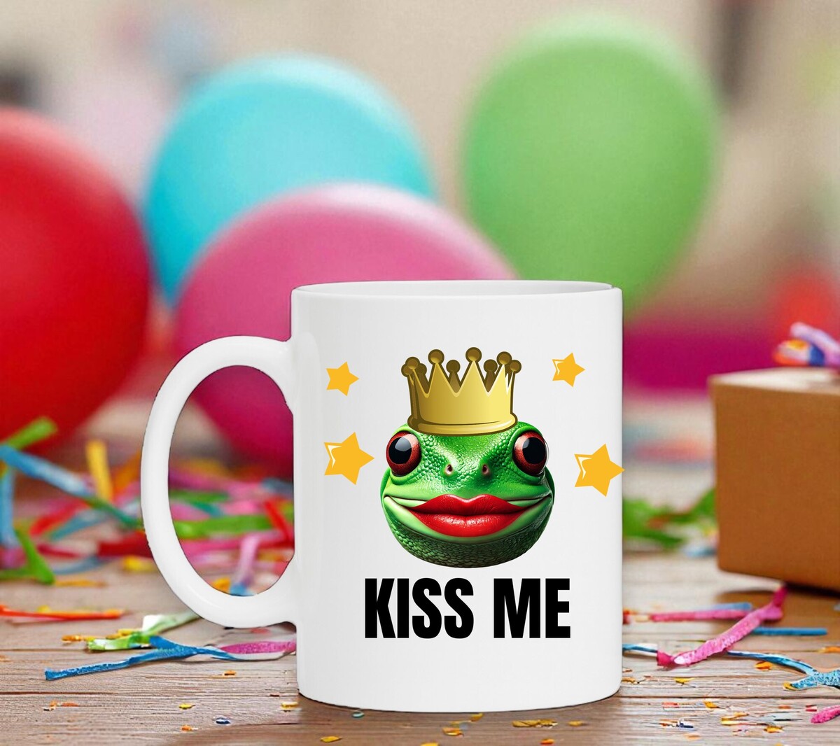 Leuke koffiemok met de opdruk van een kikker en de tekst eronder Kiss me.