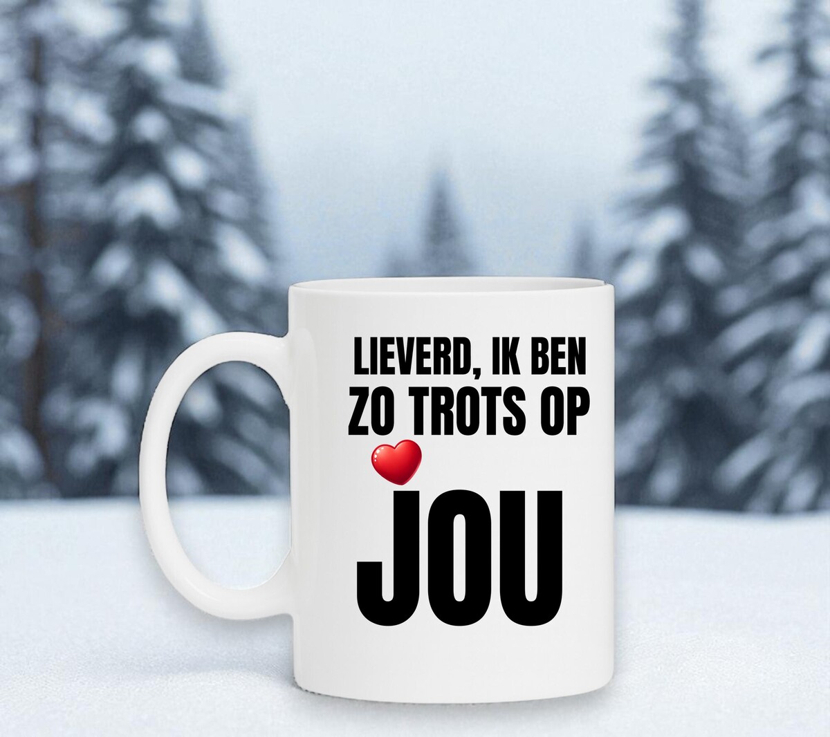 Een hele lieve koffie of thee mok met de lieve opdruk 'Lieverd, ik ben zo trots op jou'.