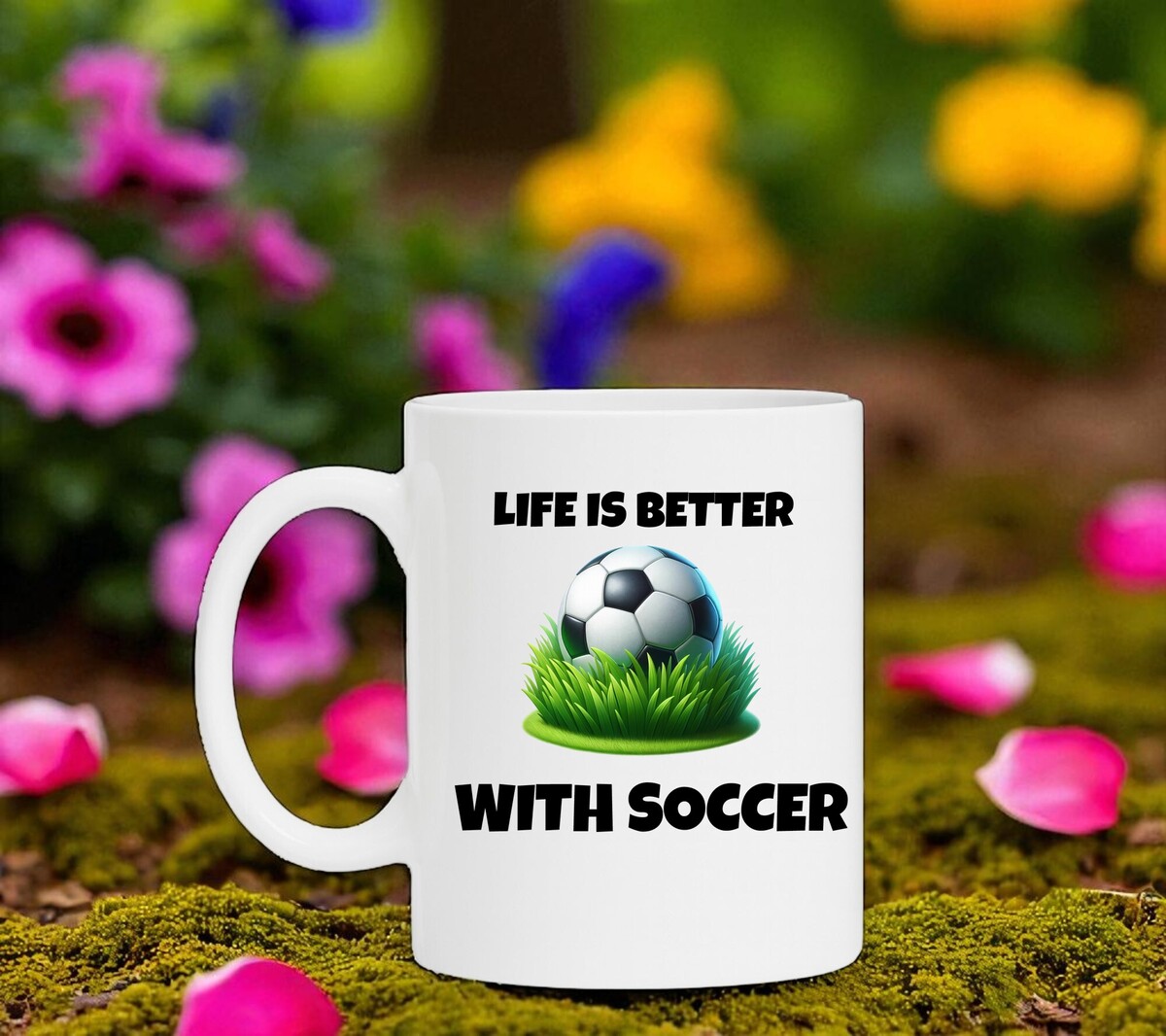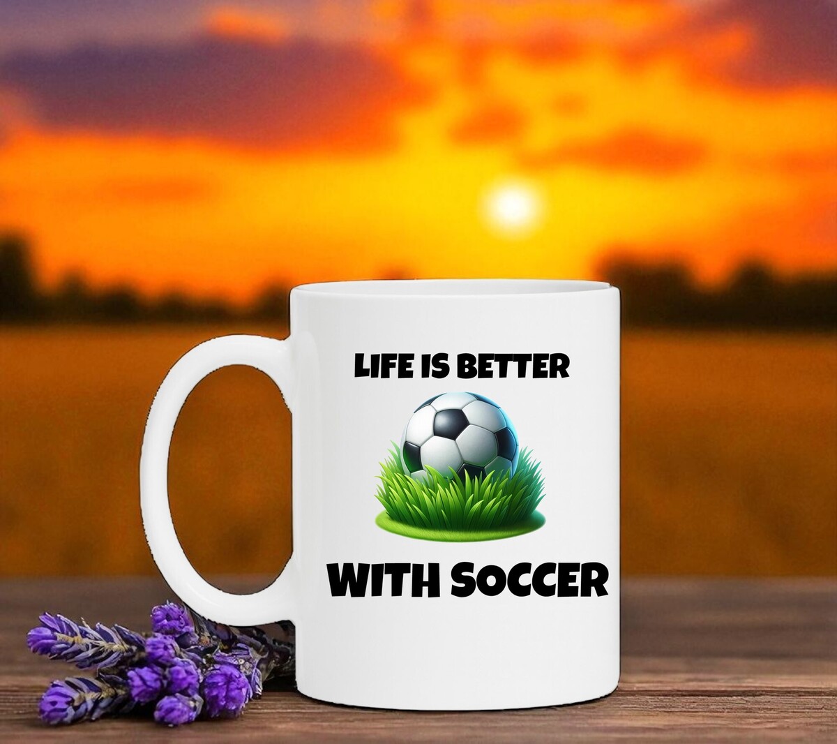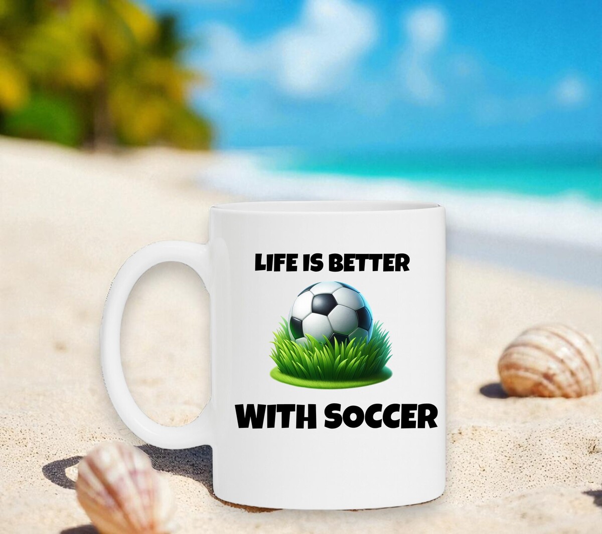 Mok life is better with soccer. De witte koffie of thee mok is vaatwasserbestendig en magnetronbestendig. De mok heeft een hoogte van 96mm en een diameter van 80mm.