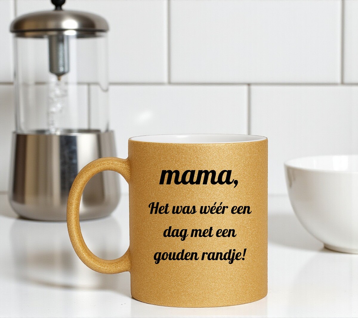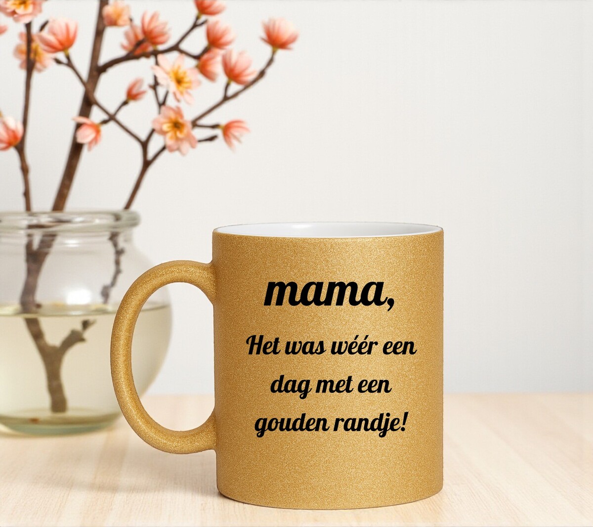 De gouden glittermok heeft een hoogte van 96 mm, een diameter van 80 mm en een inhoud van circa 330 ml. Door de glittercoating is deze mok niet geschikt voor de magnetron en wordt handwas aanbevolen om de opdruk en glans te behouden.