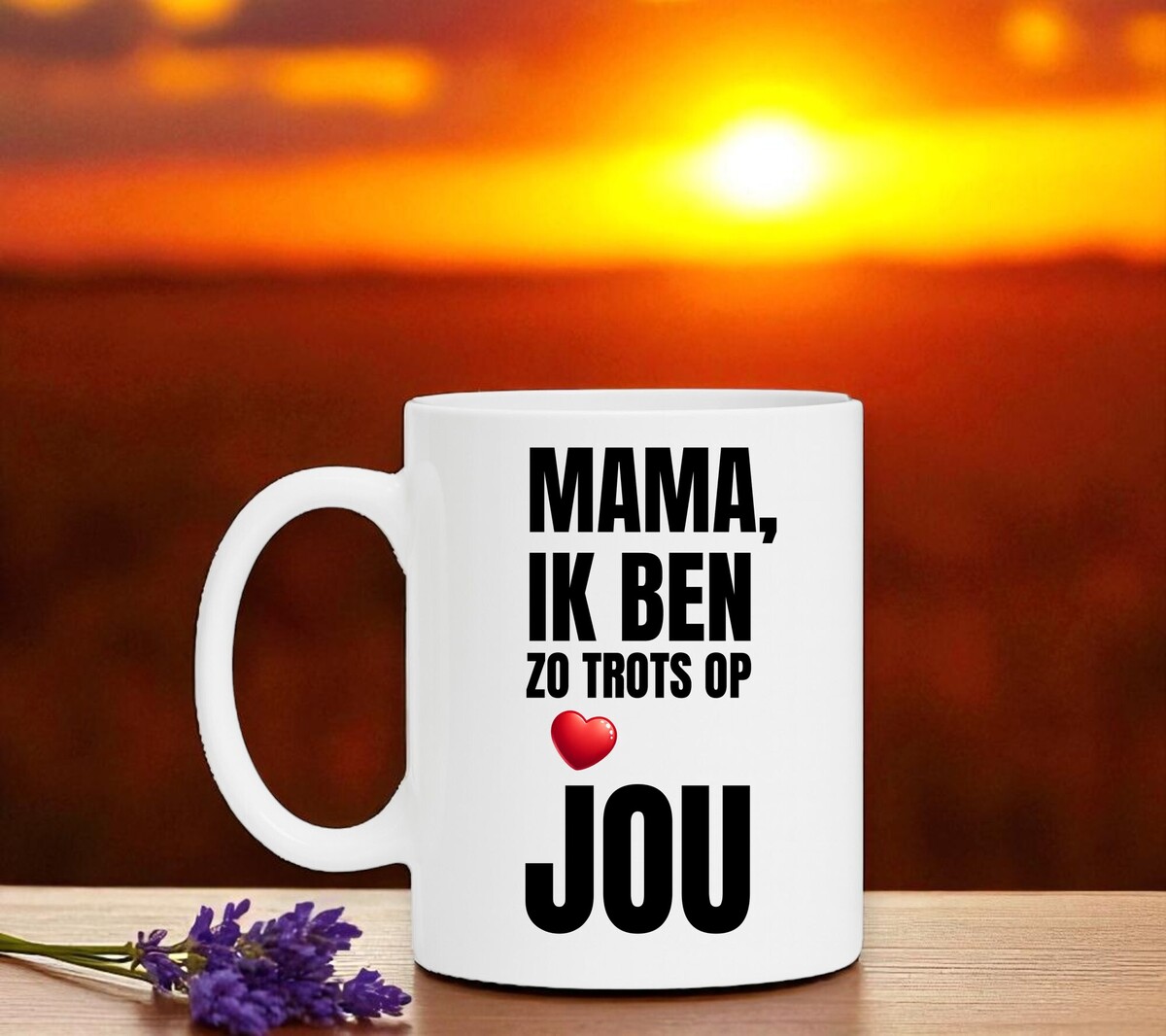 Een super lieve koffie mok voor jouw lieve moeder. Een leuk moederdag kado. Op de mok staat de opdruk 'Mama ik ben zo trots op jou'.