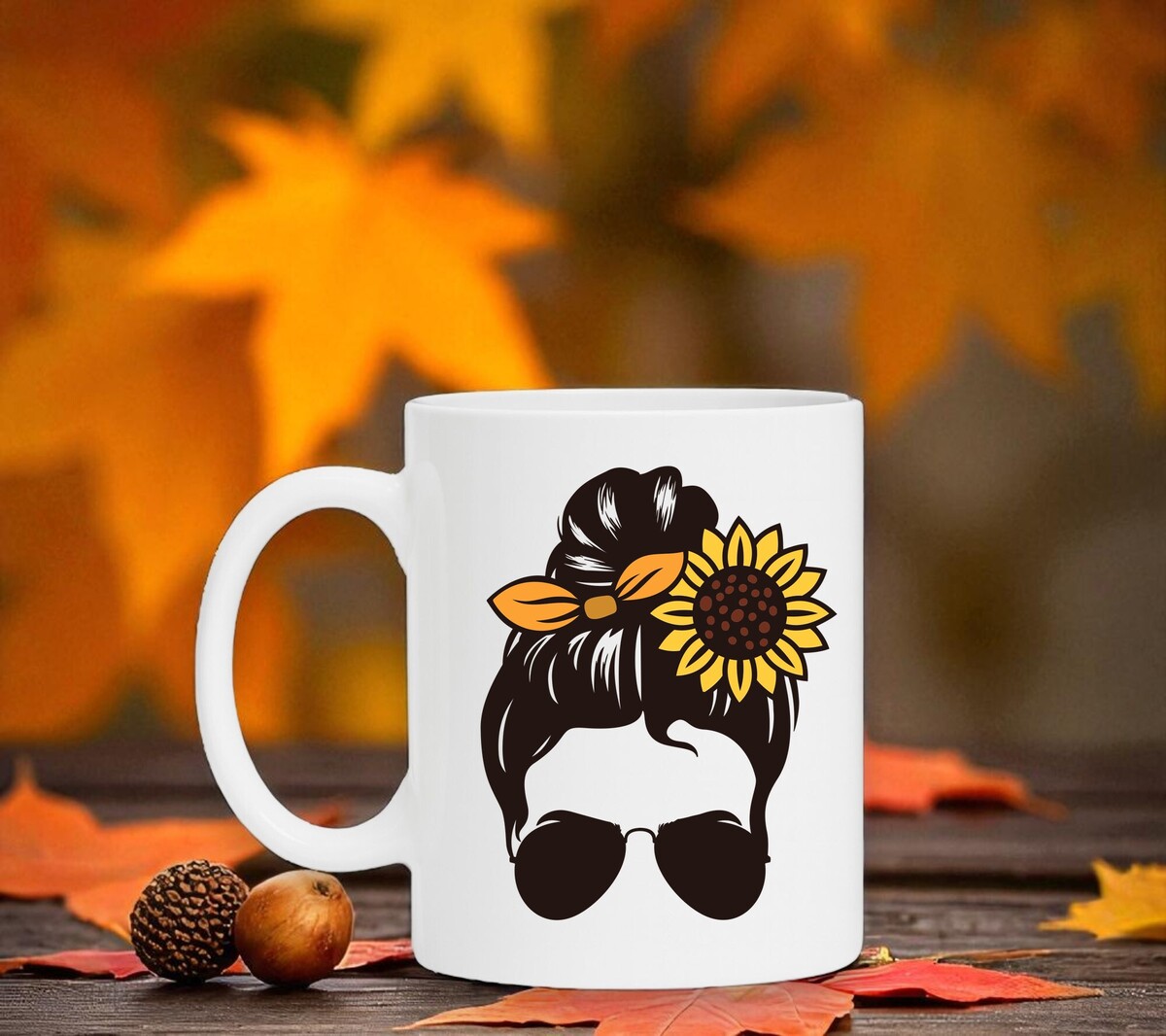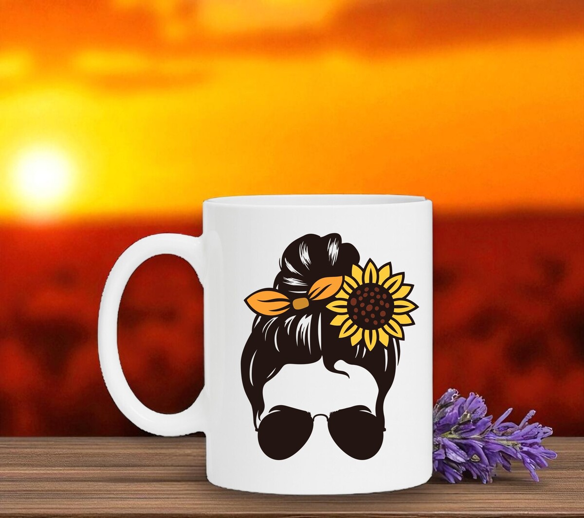 Mok messy sunflower-hair bun rommelige knot met zonnebloemhaar. De mok is vaatwasserbestendig en heeft een hoogte van 96mm en een diameter van 80mm.