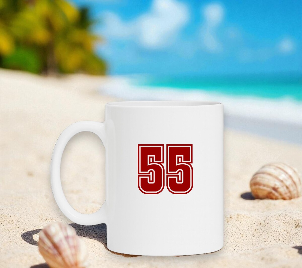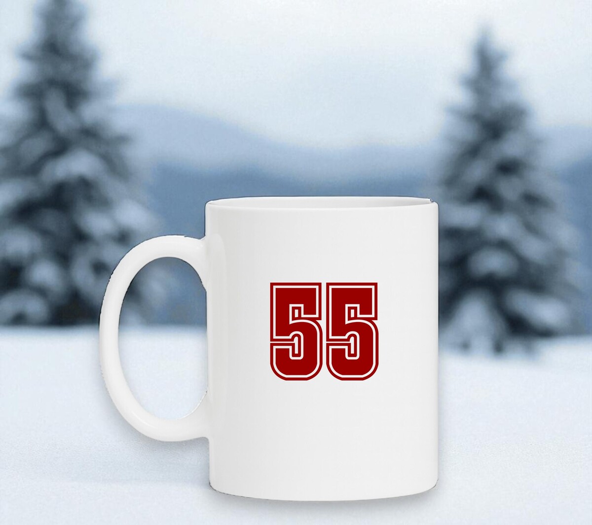 Mok met cijfer 55 als opdruk. In de kleur robijnrood.