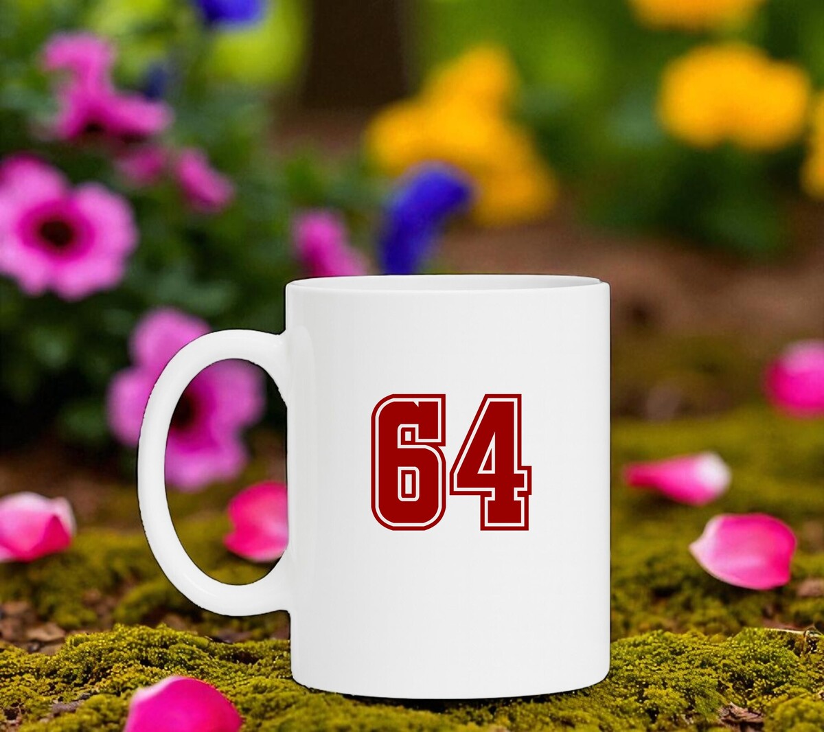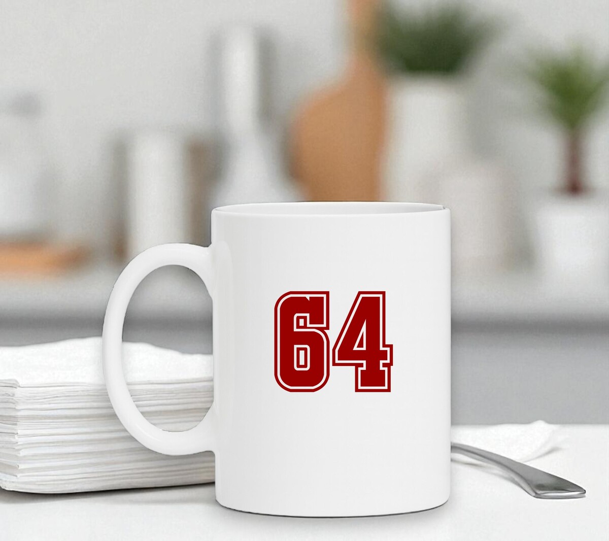 Mok met cijfer 64 opdruk in de kleur robijnrood.