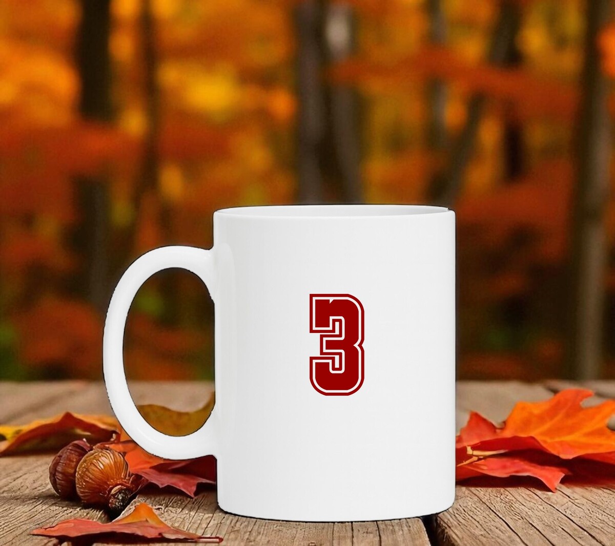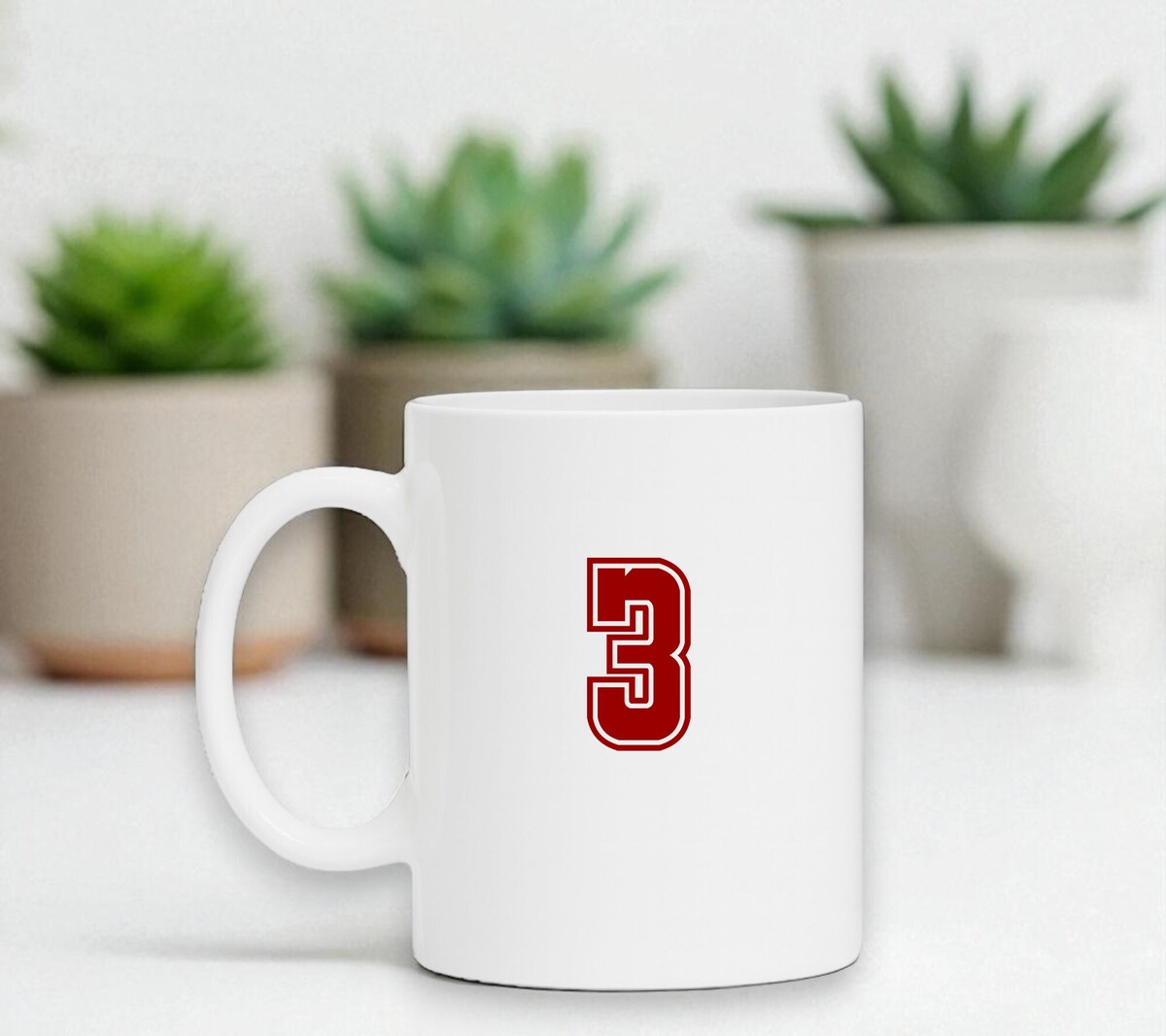 Mok met getal 3 erop. Het getal 3 is in de kleur robijnrood erop gedrukt.