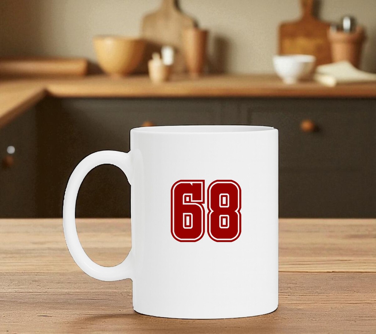 Mok met getal 68 erop gedrukt in de fraaie kleur robijnrood. De hoogte van de mok is 9cm.