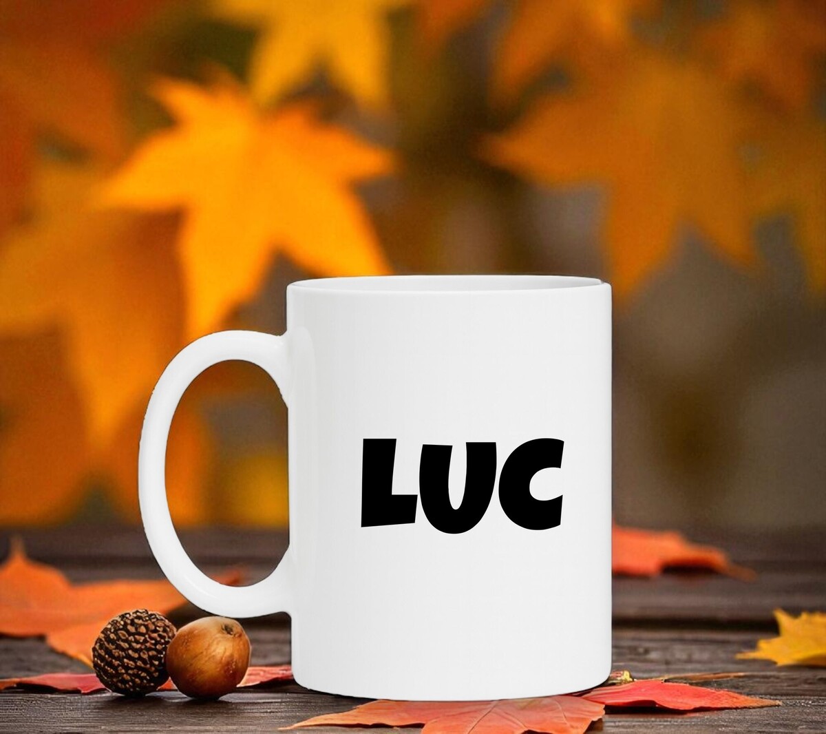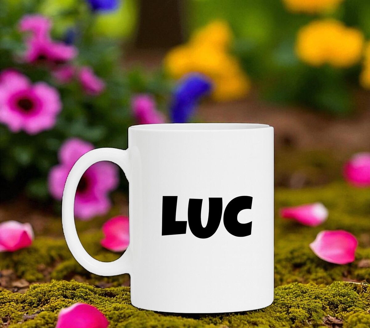 Witte koffie of thee mok met naam Luc. De witte koffie of thee mok is vaatwasserbestendig en magnetronbestendig. De mok heeft een hoogte van 96mm en een diameter van 80mm.