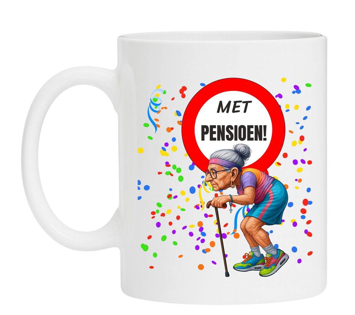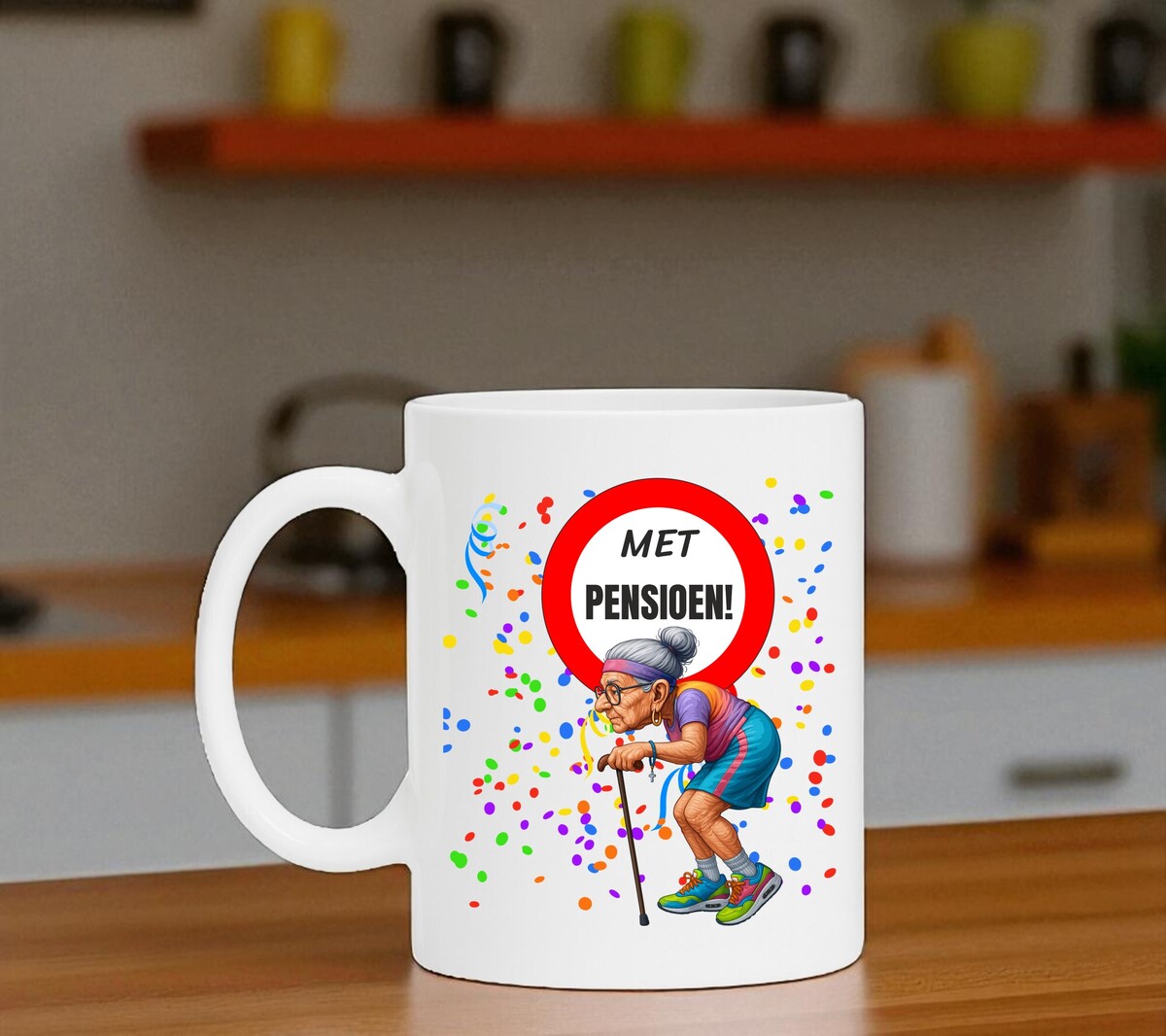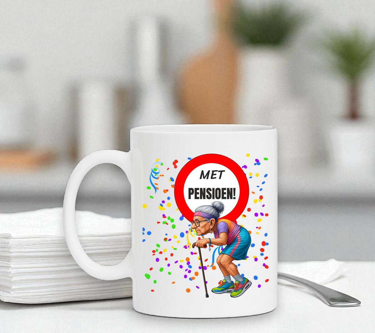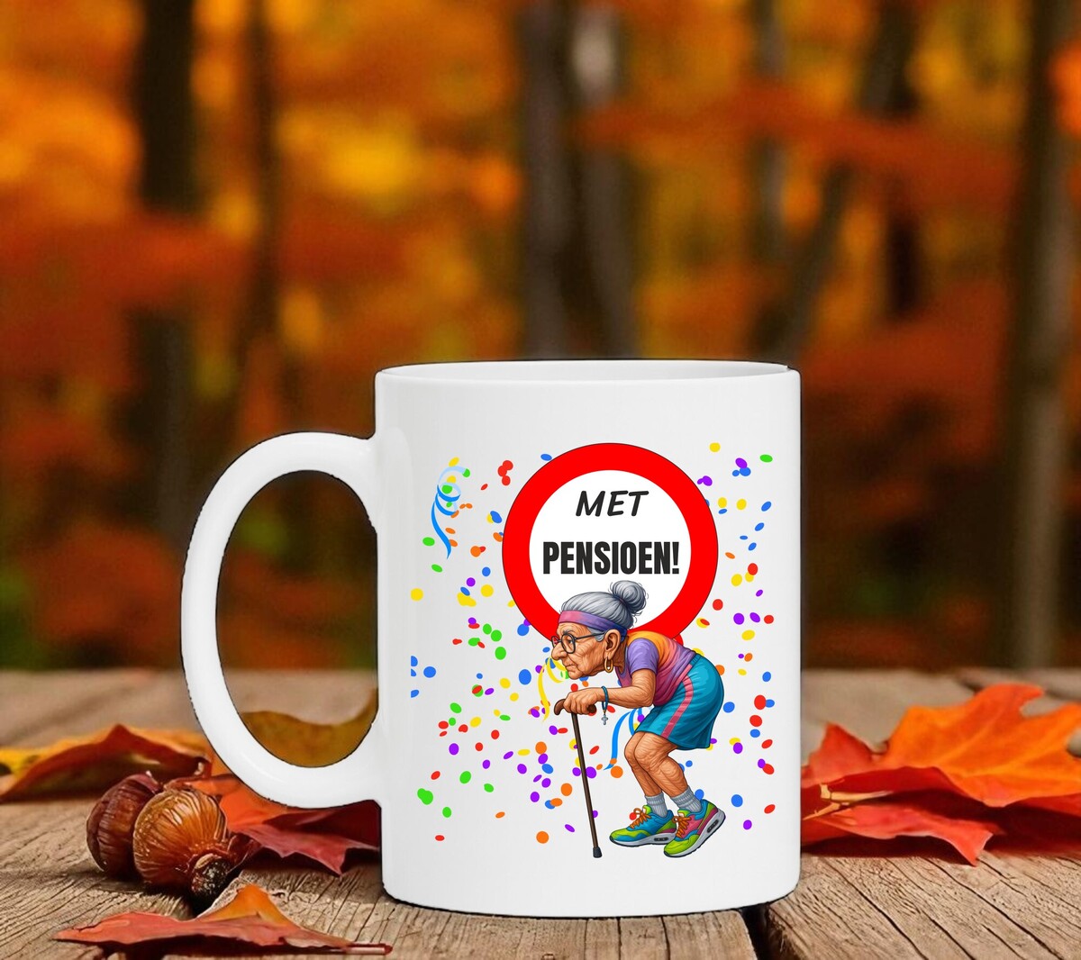 Op zoek naar een vrolijk en origineel pensioen cadeau? Deze koffiemok met een afbeelding van een oude vrouw met wandelstok en een verkeersbord met de tekst 'Met Pensioen' is perfect! Een humoristische manier om een vrouwelijke collega in het zonnetje te zetten als ze haar welverdiende pensioen ingaat. Of je nu een collega verrast of als werkgever een speciale herinnering meegeeft, deze mok is een leuke knipoog naar de nieuwe fase vol vrije tijd. Het ideale cadeau om afscheid te nemen met een lach en haar te laten genieten van vele gezellige koffiemomenten in haar pensioen! De mok heeft een hoogte van 96mm en een diameter van 80mm.