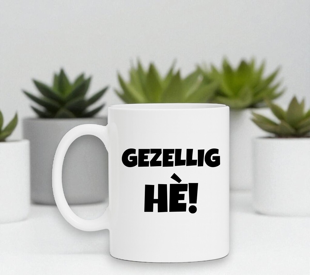 Een witte koffiemok met de tekst 'Gezellig he!'